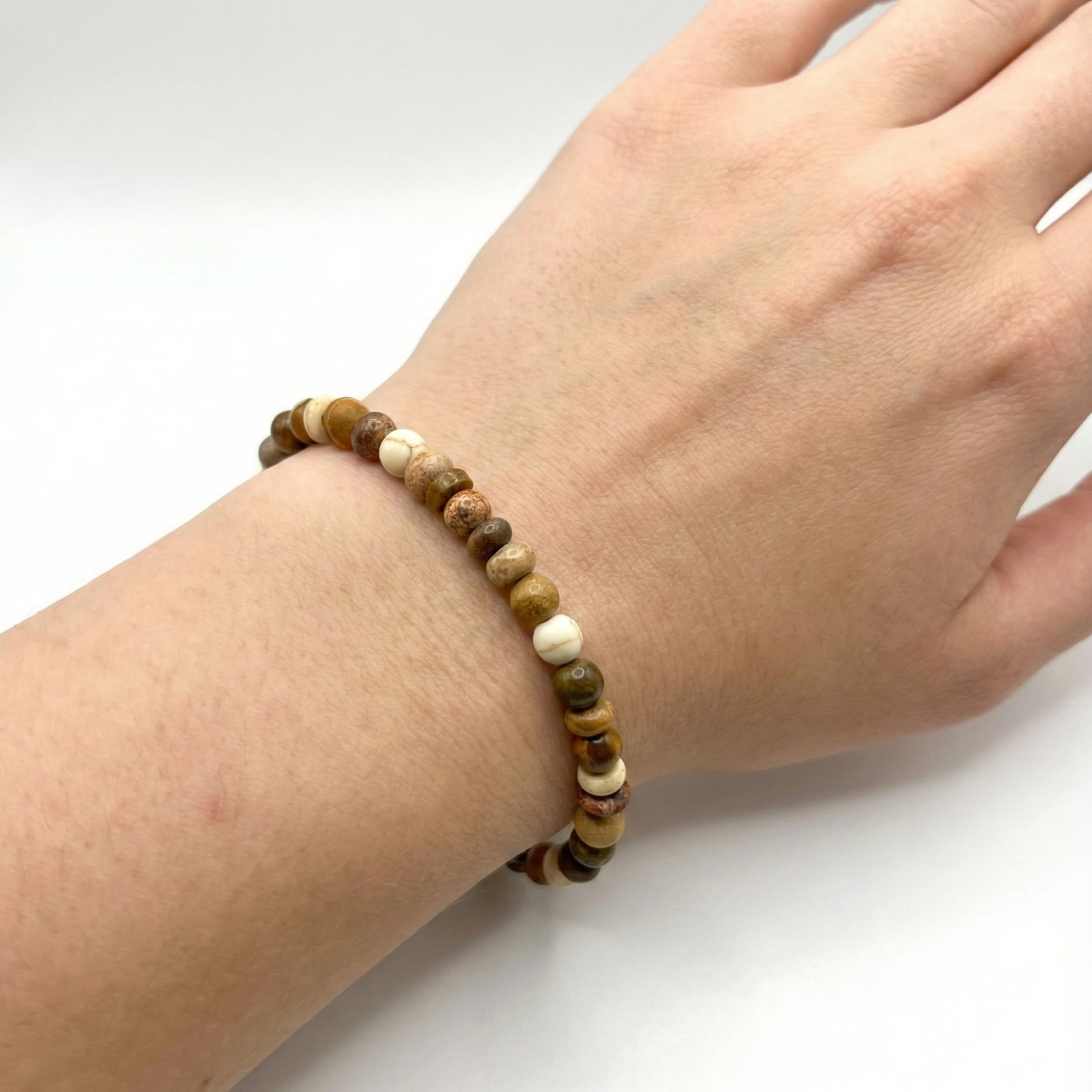 בצמיד הזה בחרתי בקפידה אבני חן בצבעי אדמה, בצורות ומרקמים מגוונים. רציתי ליצור תכשיט שיש בו פשטות יחד עם עומק.