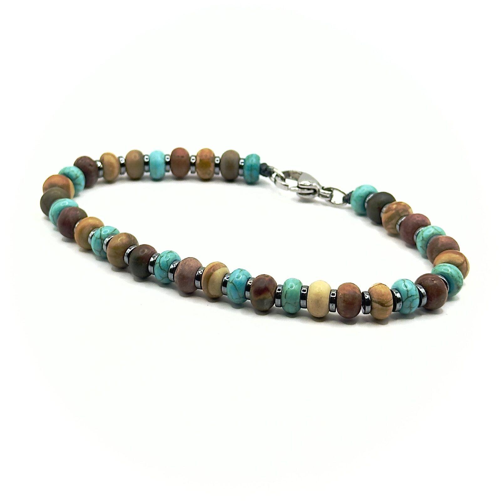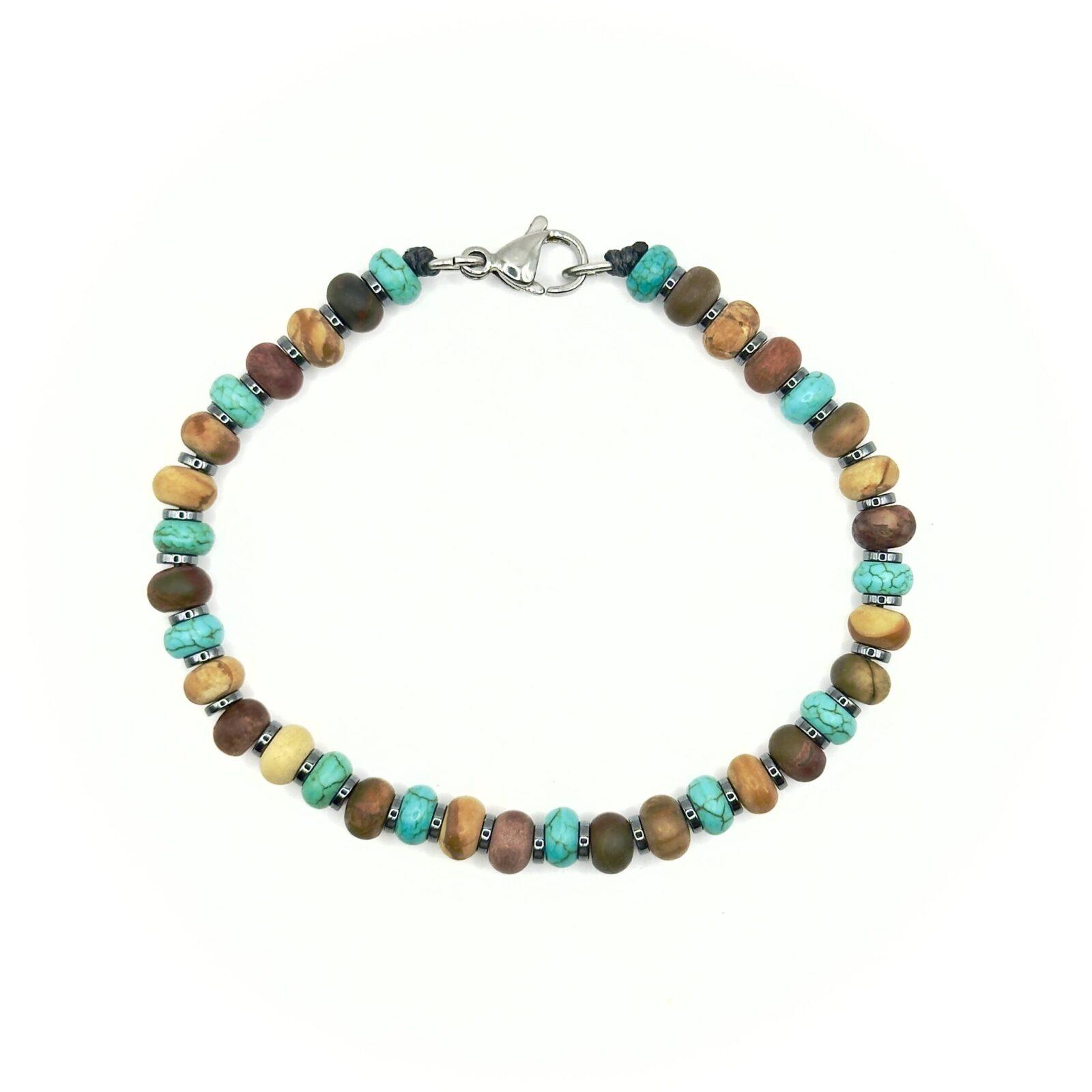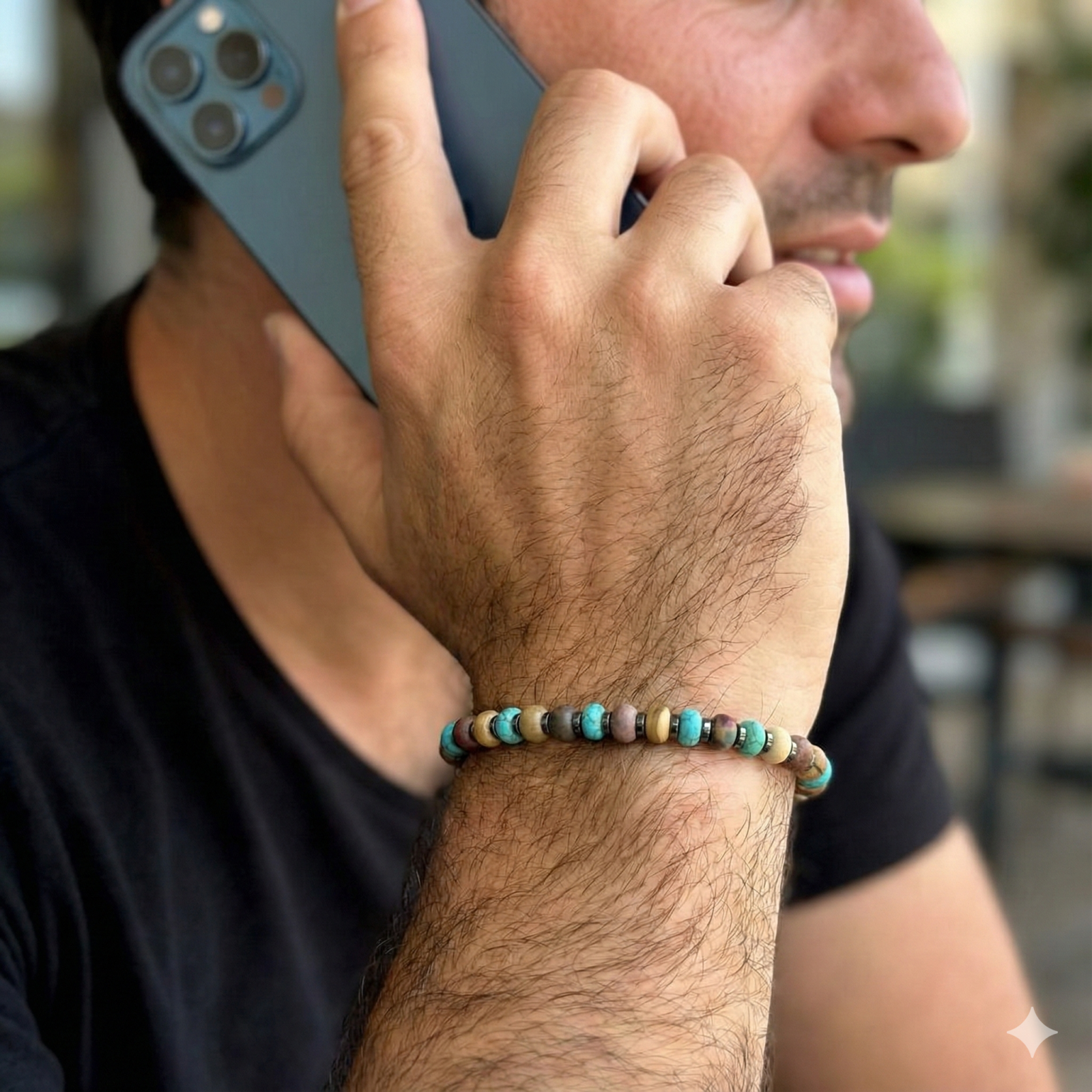 בצמיד אגפנטוס גווני הטורקיז העמוקים פוגשים את החום הרך של הג׳ספר. מהשילוב הזה נוצר איזון מושלם בין תנועה לשקט.