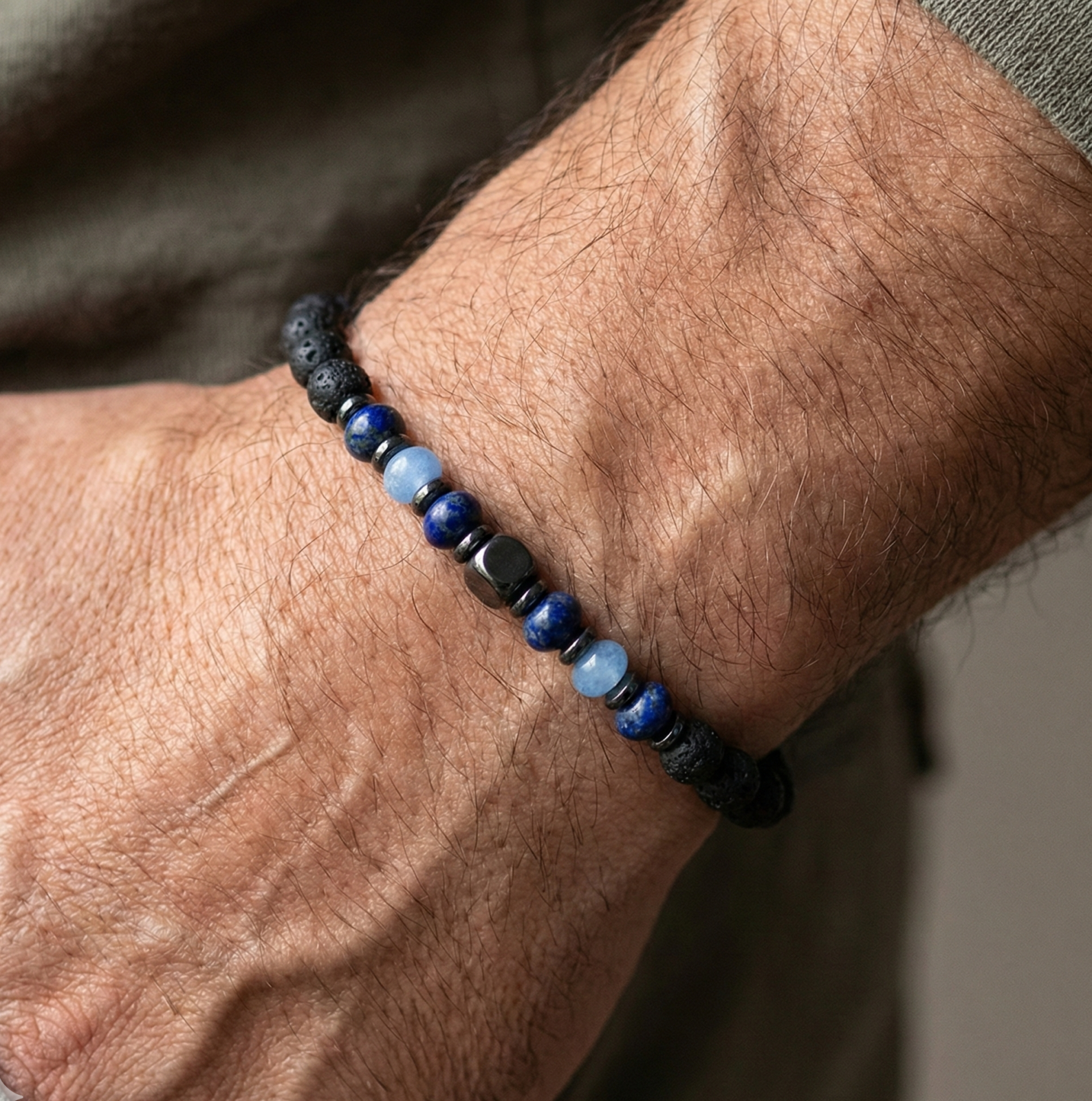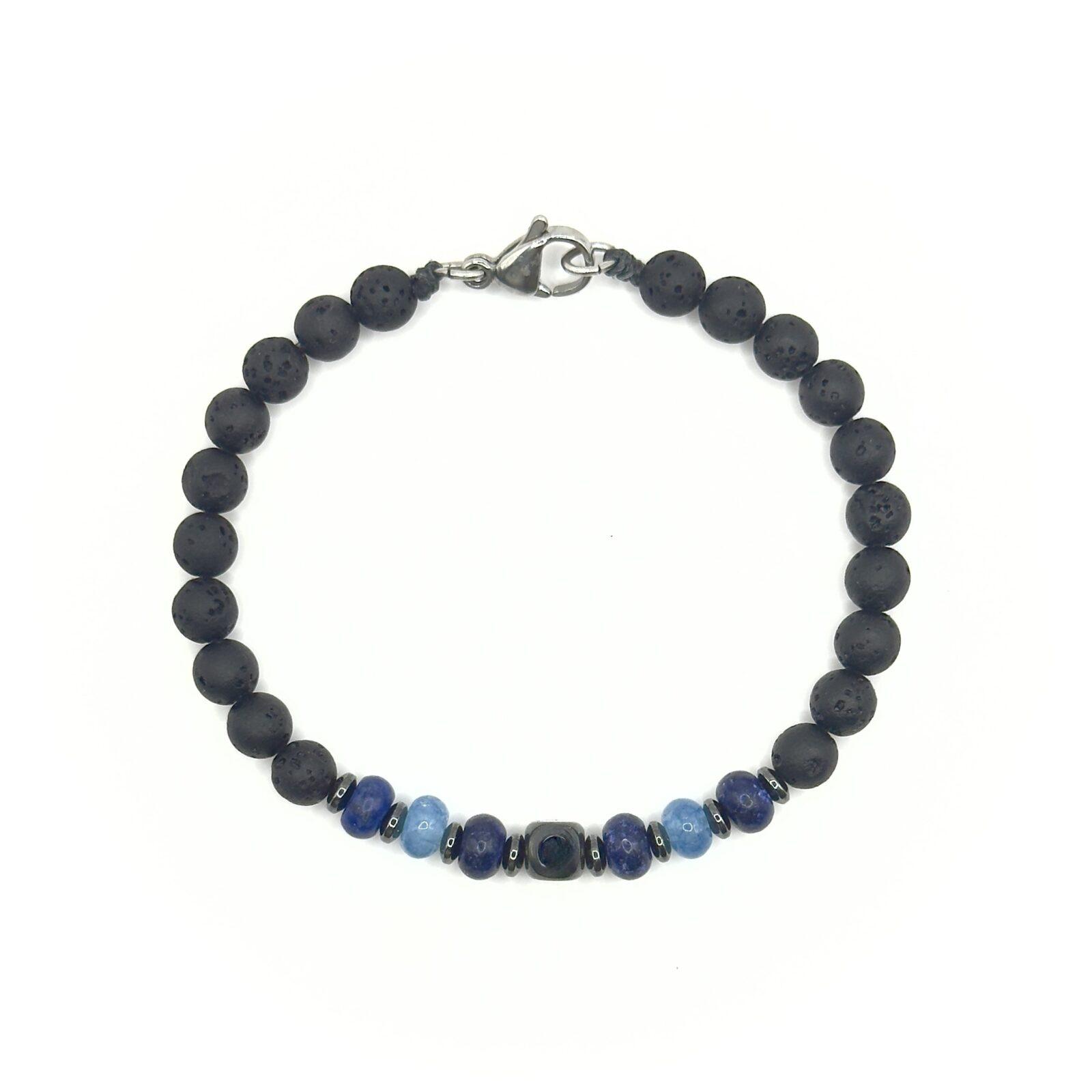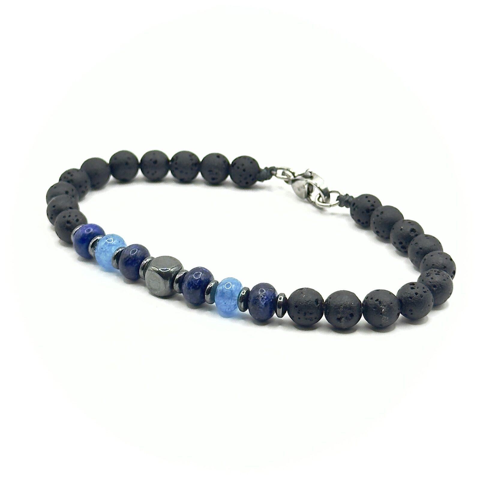 צמיד יוניסקס שזור בעבודת יד מאבני לבה שחורות וביניהן פזורות אבני אפטייט ולפיס לזולי בגוונים כחול עמוק ותכלת.