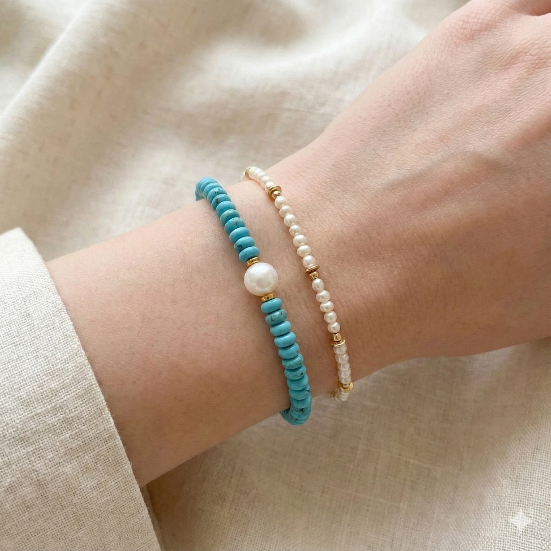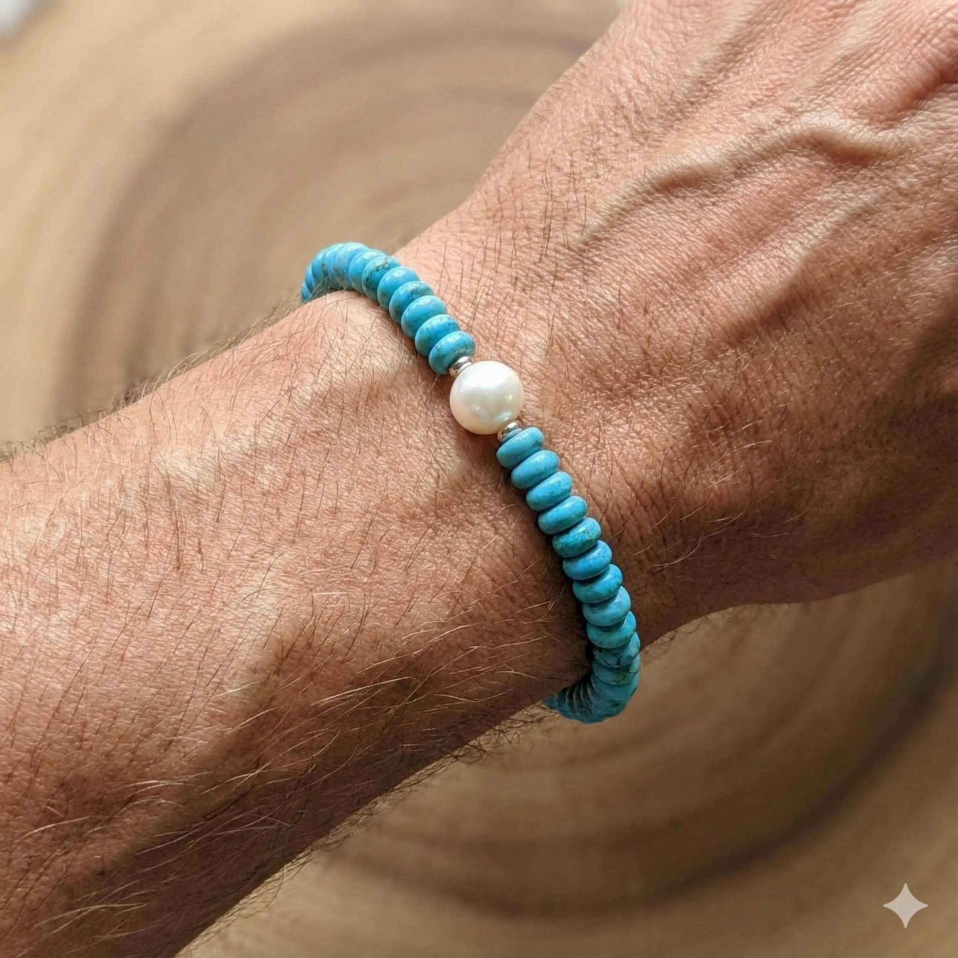 צמיד שזור בעבודת יד מאבני טורקיז בגוון תכלת עז, עם פנינה טבעית במרכז ונגיעות מוזהבות או כסופות עדינות.