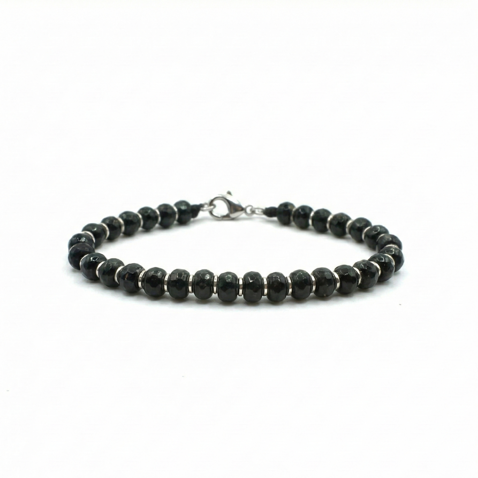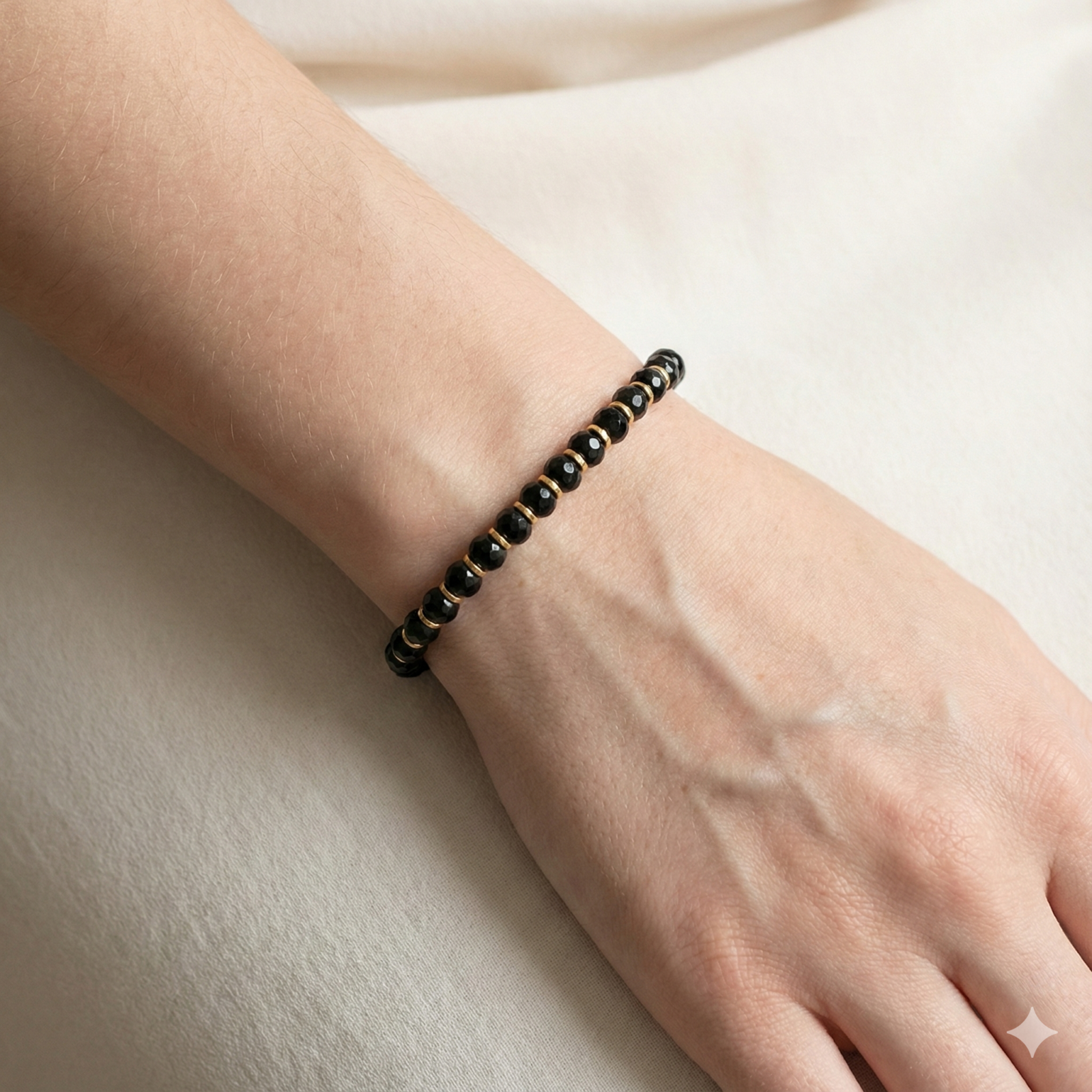 צמיד לנשים אלגנטי שזור בעבודת יד מאבני אוניקס שחורות מבריקות ומסותתות עם הפרדות של חרוזי אבן המטייט מוזהבים.