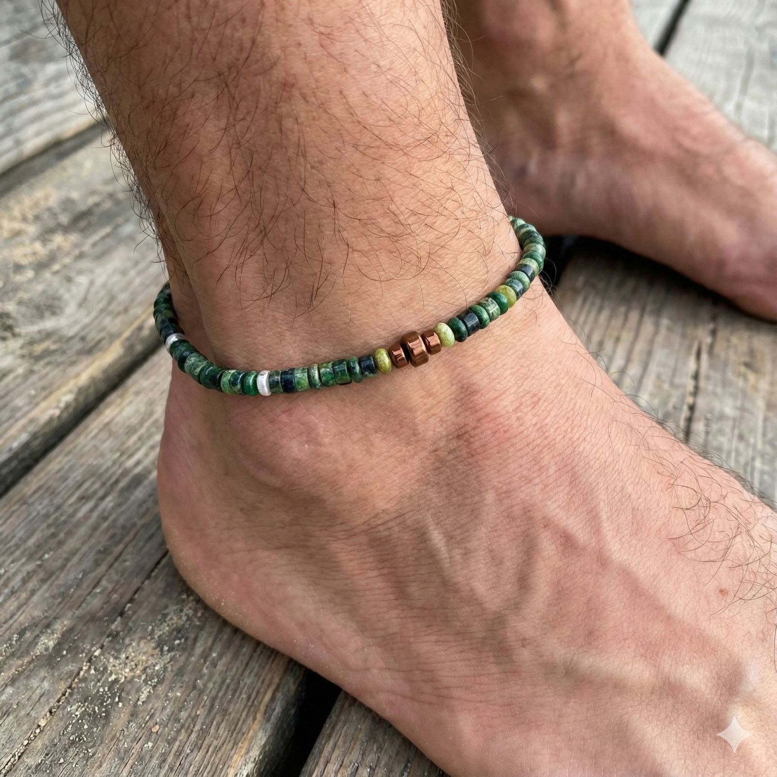 צמיד רגל בעבודת יד אלגנטי ועדין שזור משילוב אבני ג'ספר טבעיות בגווני ירוק, חום וזהב, המסודרות בהרמוניה.