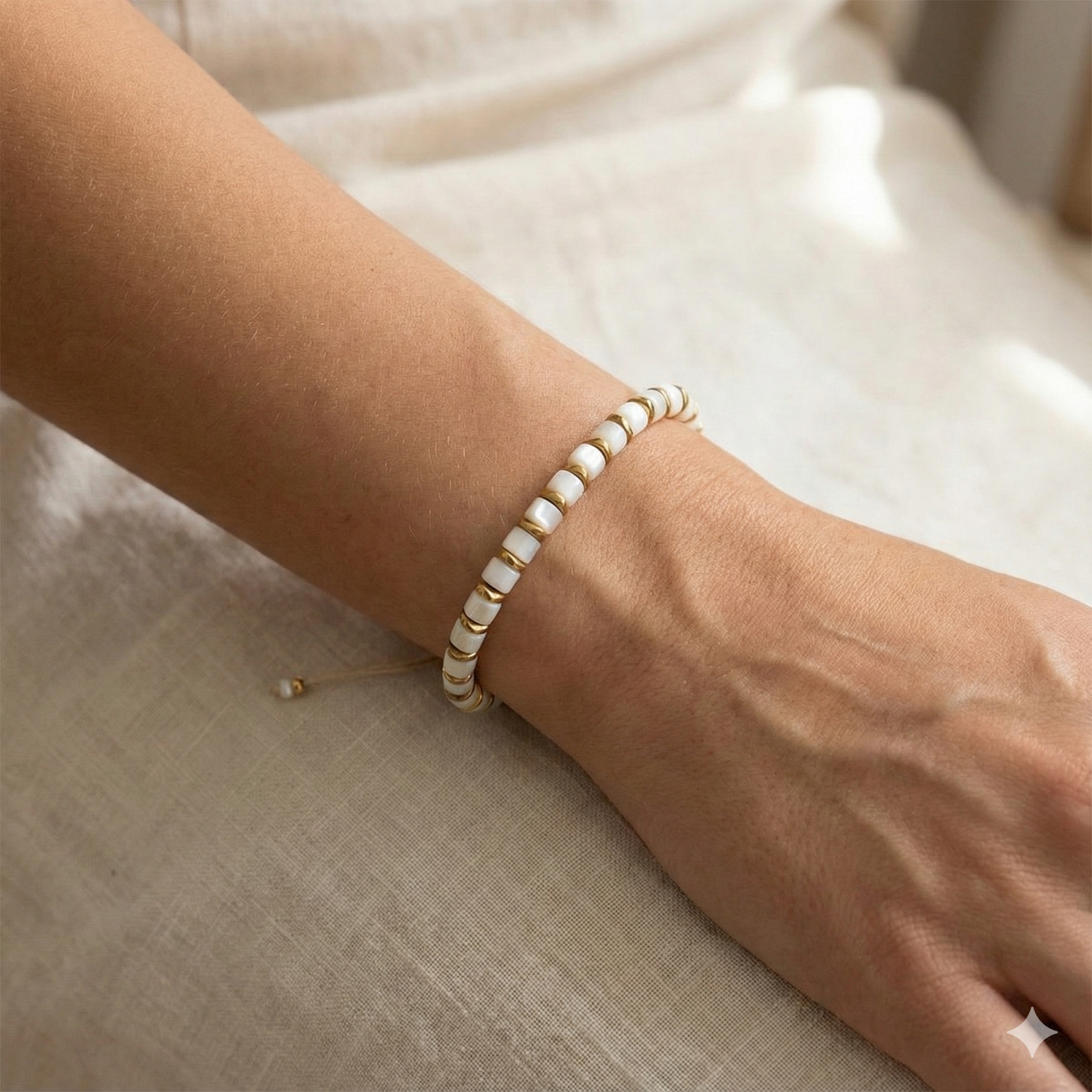 צמיד שנשזר בעבודת יד מחרוזי אם הפנינה (צדפה) עם הפרדות המטייט מוזהבות בגימור מתכתי מבריק.