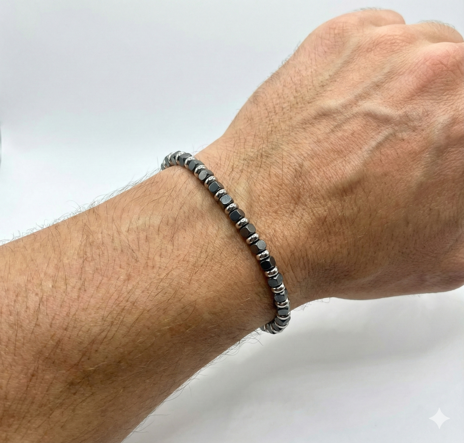 צמיד שנשזר בעבודת יד מאבני המטייט שחורות בגימור מט, מופרדות בחרוזי מתכת כסופים וסוגר תואם.
