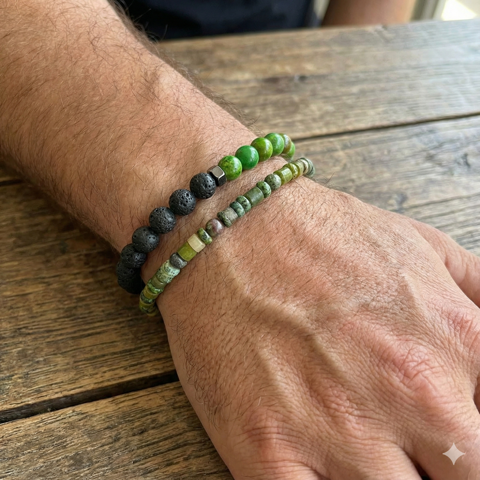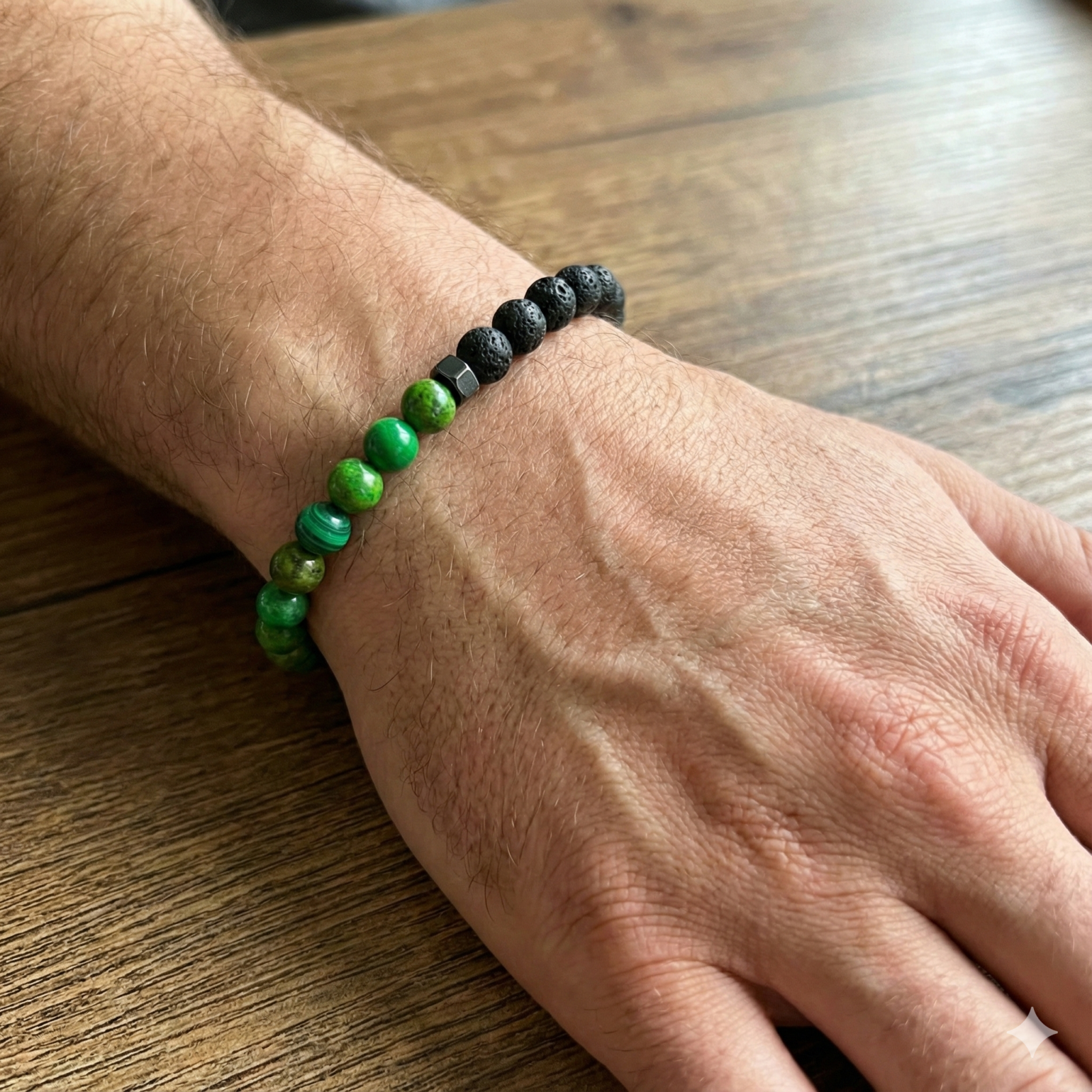 צמיד שנשזר בעבודת יד מאבני טורקיז ירוקות ואבני לבה שחורות, עם אלמנט המטייט מתכתי להשלמת המראה.