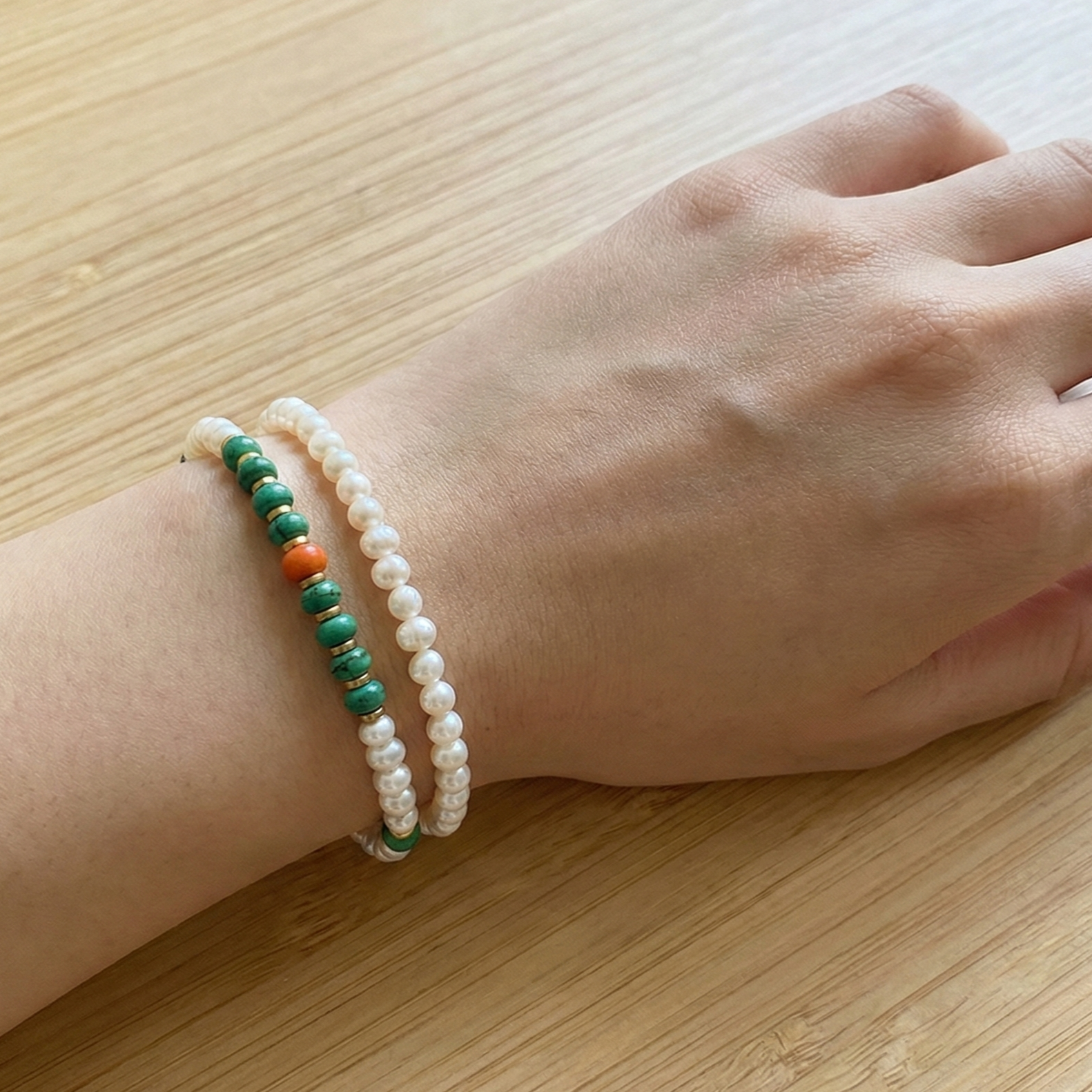 צמיד לנשים בעבודת יד שזור מאבני טורקיז טבעיות, פנינים ואבן קורל כתומה במרכז.