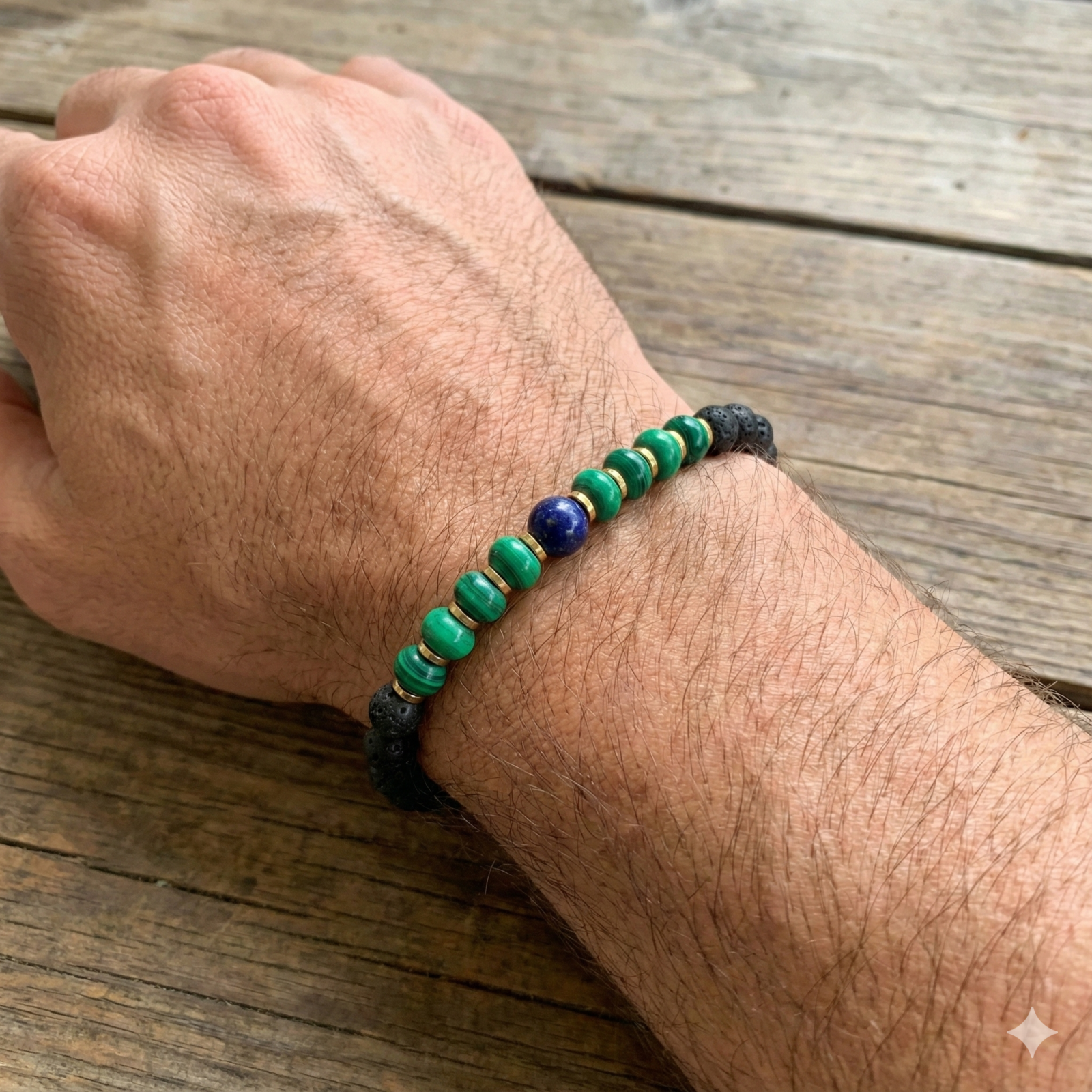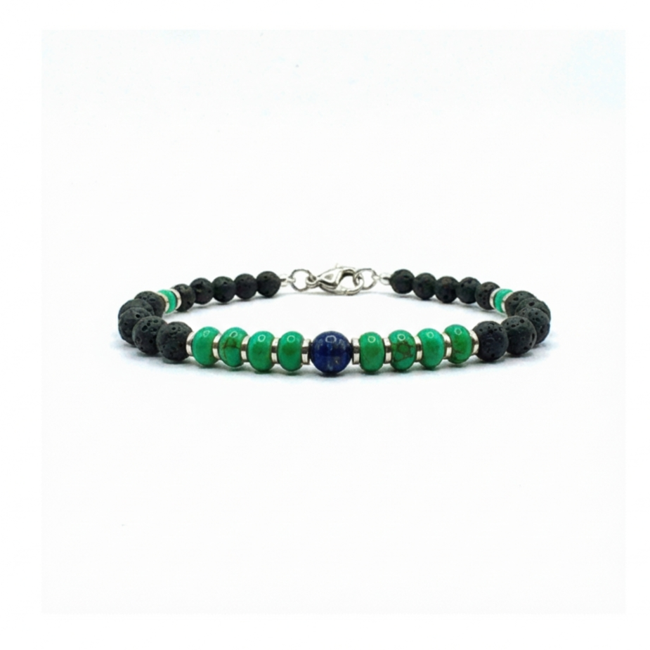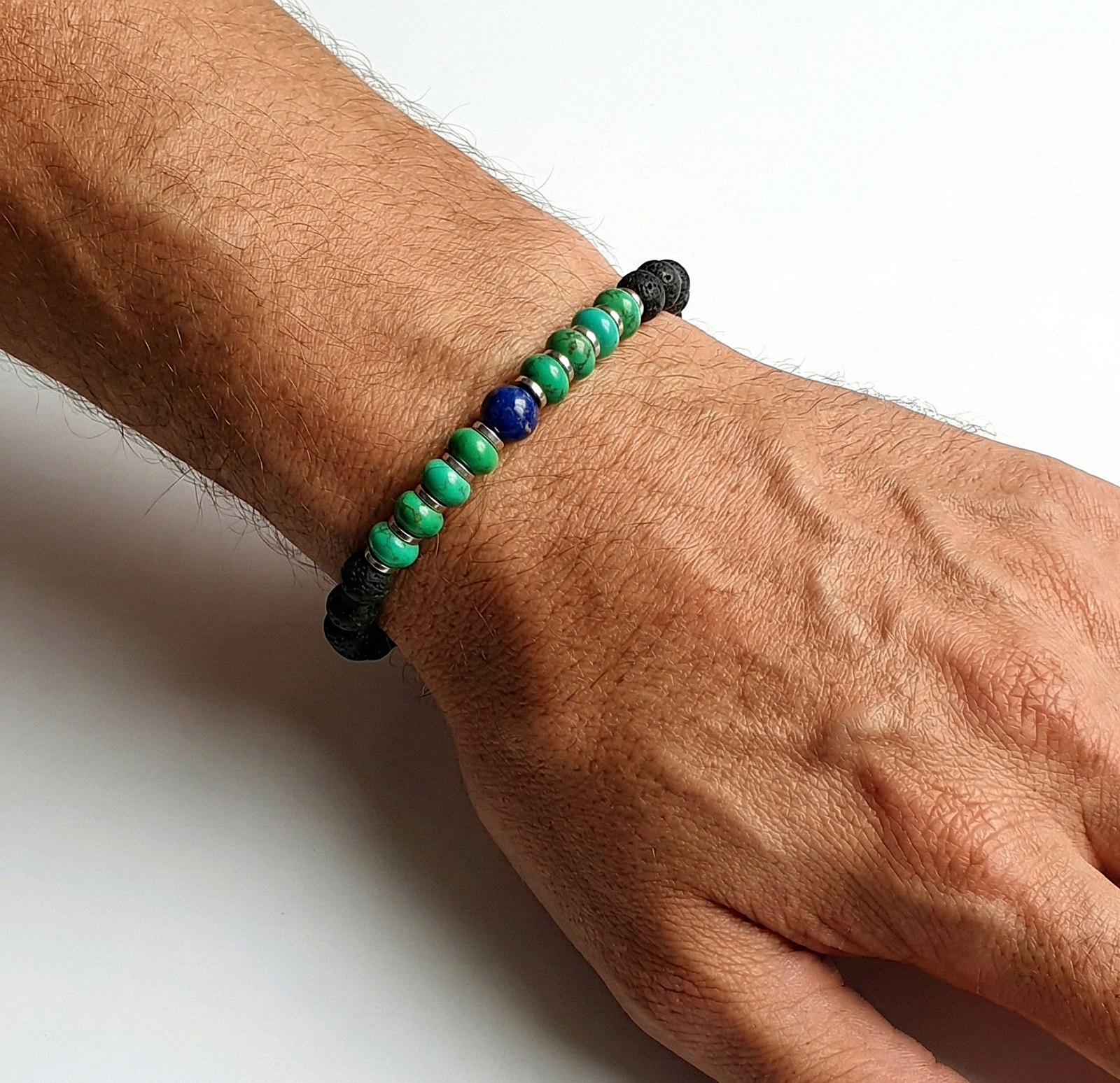 צמיד לגבר שנשזר בעבודת יד מאבני לאפיס כחולות, אבני טורקיז ירוקות ואבני לבה שחורות.