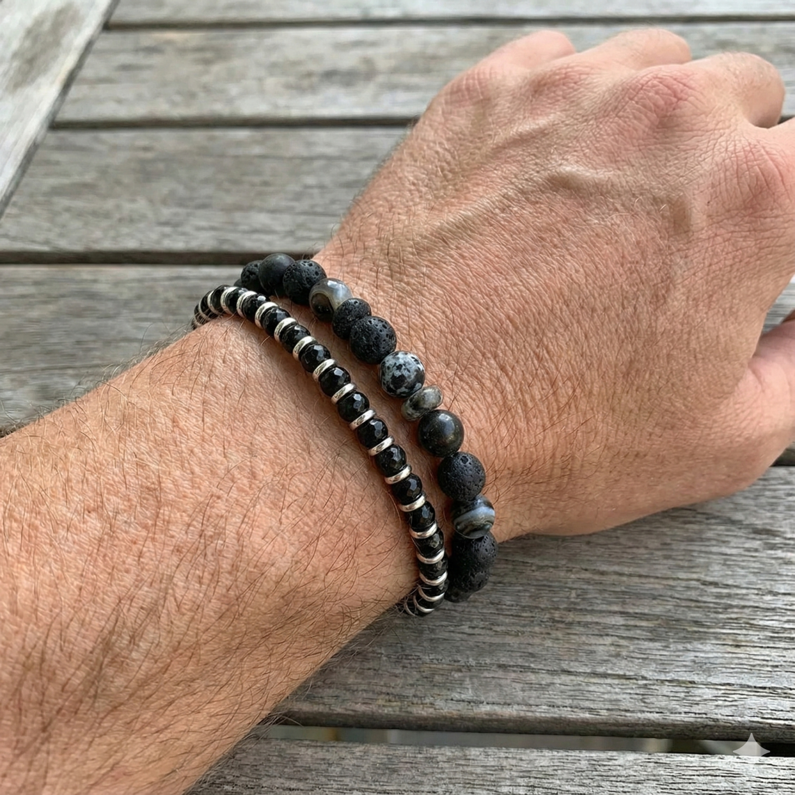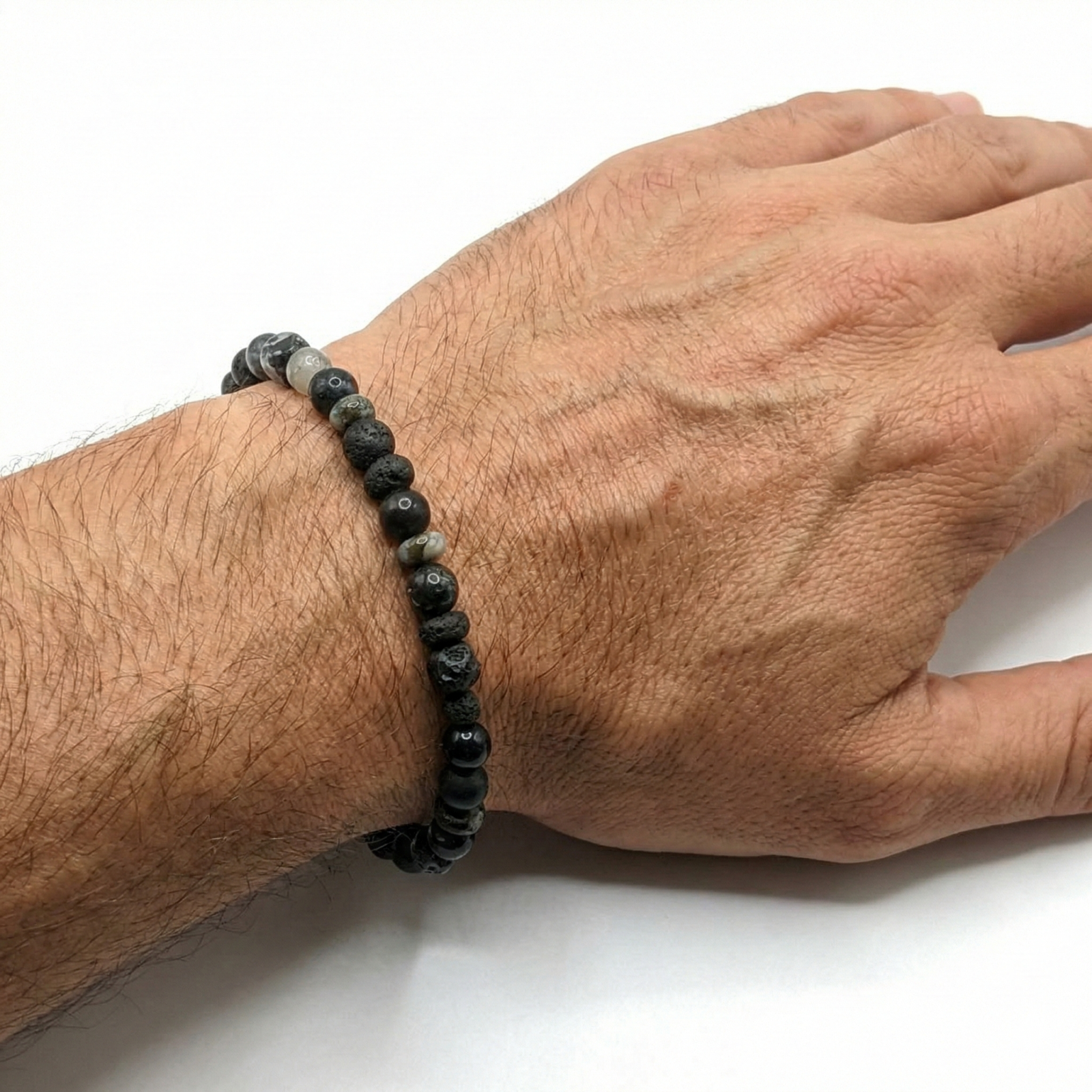 בצמיד זה בחרתי בקפידה אבני חן שחורות, בצורות ומרקמים מגוונים כמו אוניקס, לבה, ג'ספר, אגת ולברדורייט.