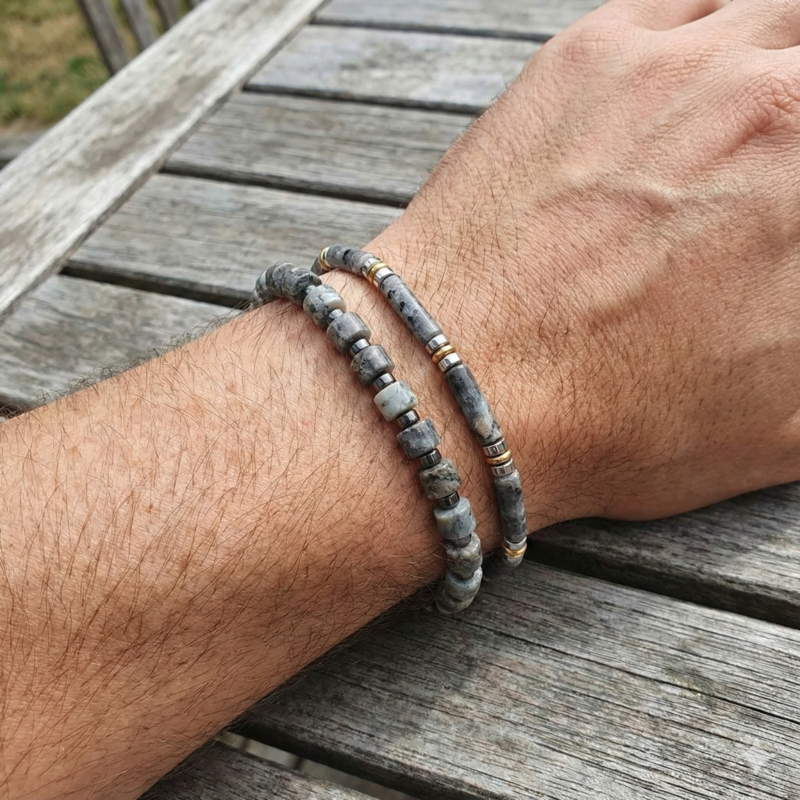 צמיד ייחודי לגבר שנשזר בעבודת יד מאבני לברדורייט גליליות בגווני אפור עם נימים טבעיים, מופרדות בחרוזי המטייט מוזהבים וכסופים.