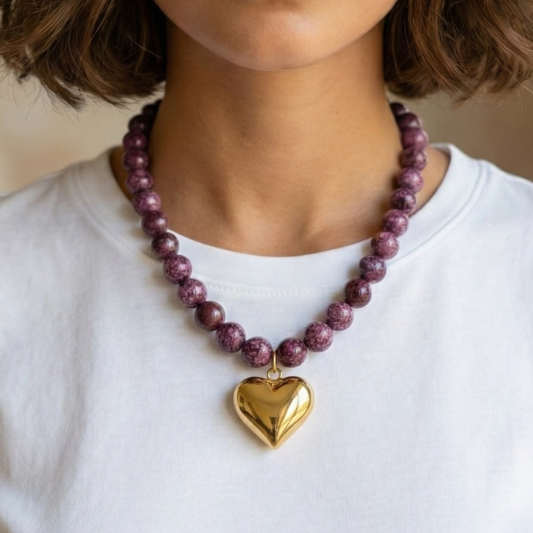 הניגודיות בין החרוזים העמוקים לבין הברק של לב הזהב יוצרת תכשיט בעל נוכחות שאי אפשר להתעלם ממנו. זו השרשרת שתקפיץ לך את הג'ינס והטי-שירט בבוקר, ותשתלב מושלם עם שמלה שחורה בערב. פריט חובה למי שאוהבת אסתטיקה נקייה עם טאץ' יוקרתי.