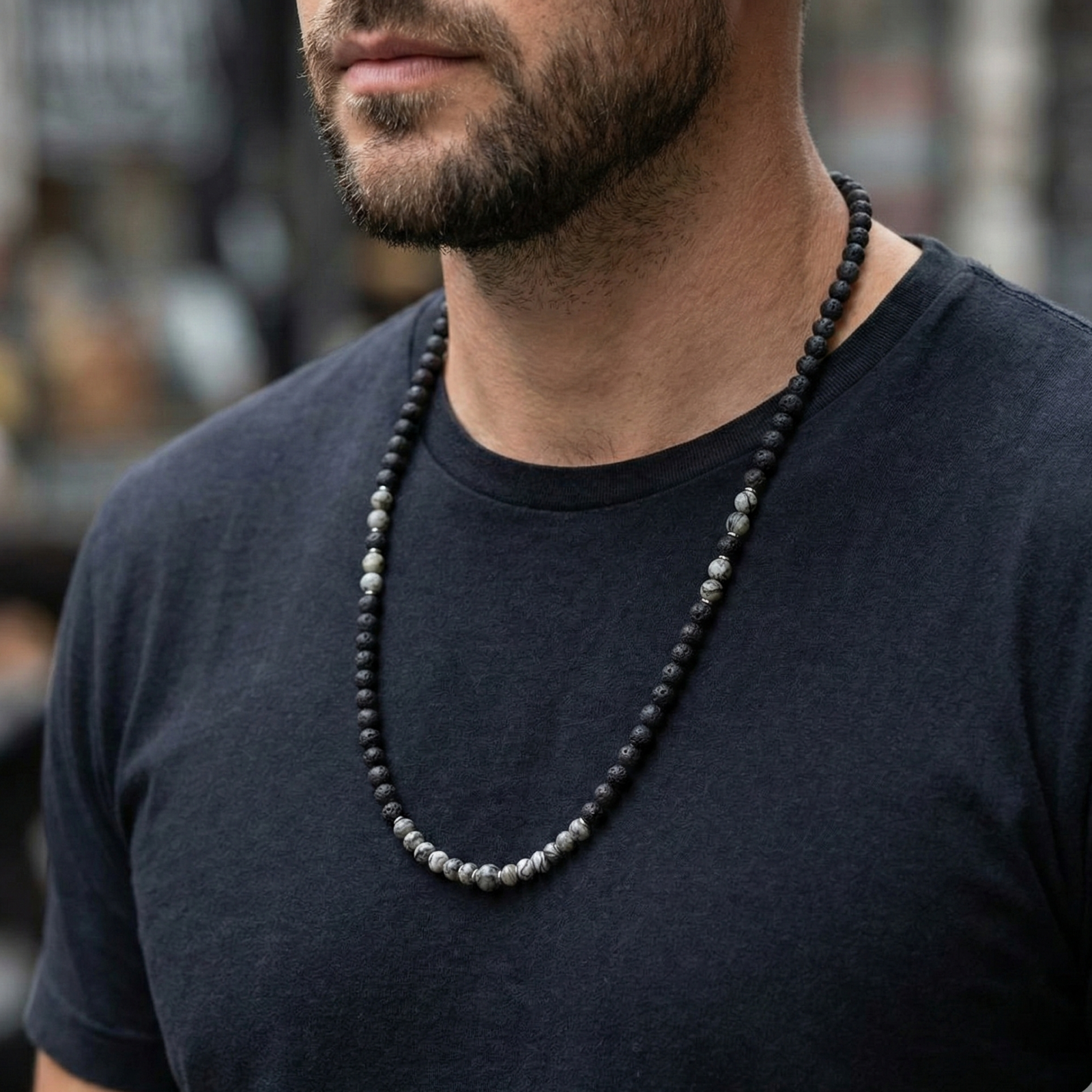 השרשרת שזורה מאבני לבה שחורות בשילוב עם אבני ג'ספר בגוני אפור-לבן.