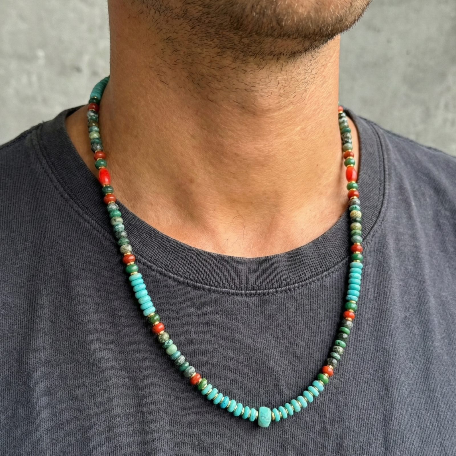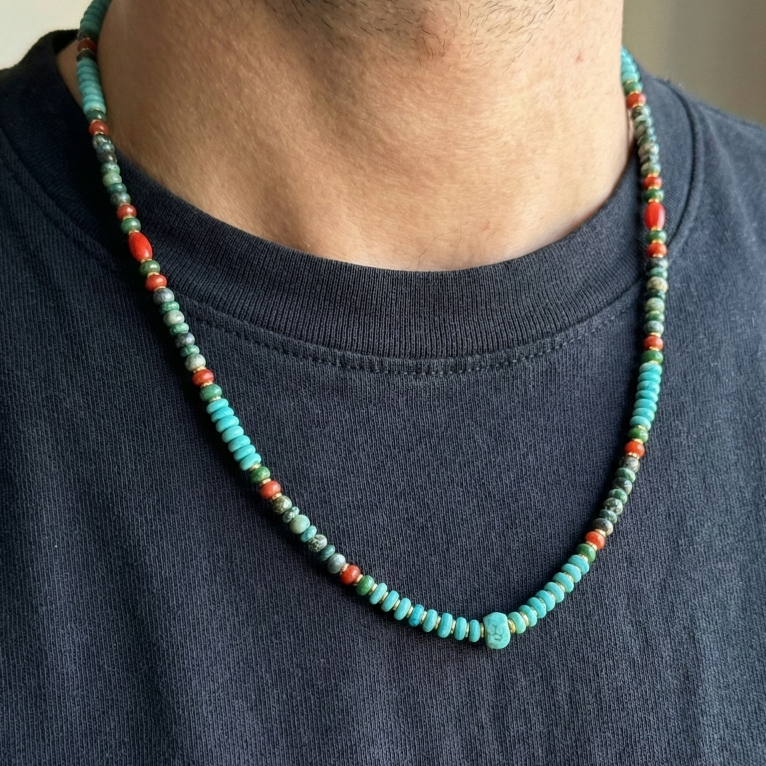 שרשרת מאלה לגבר שזורה בעבודת יד מאבני טורקיז בגווני כחול בהיר, טורקיז אפריקאי כהה, ג'ספר כתמתם וקורל טבעי.