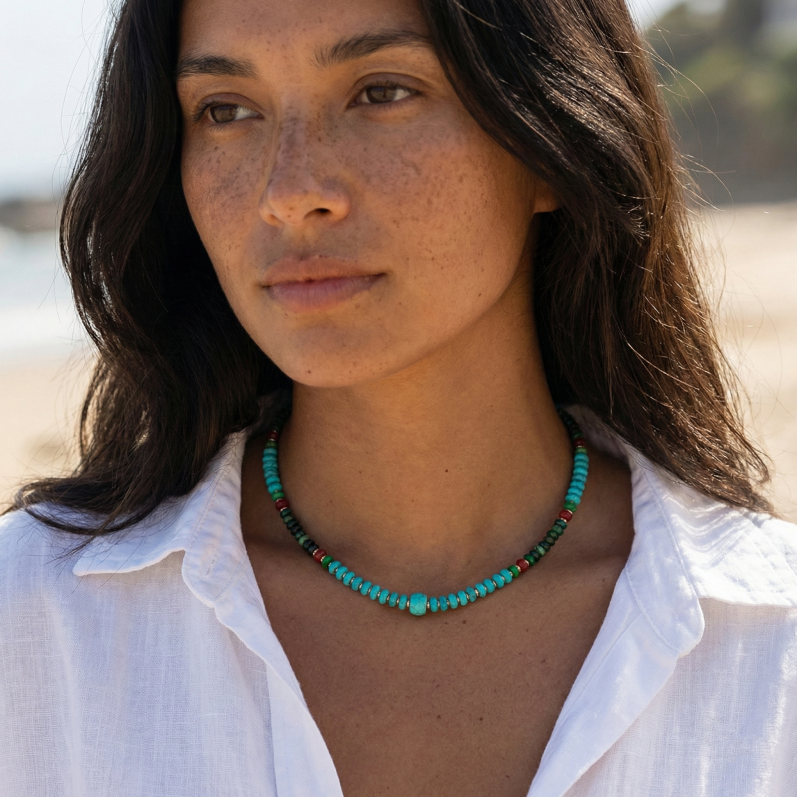 שרשרת מאלה לנשים שזורה בעבודת יד מאבני טורקיז בגווני כחול בהיר, טורקיז אפריקאי כהה, ג'ספר כתמתם וקורל טבעי.