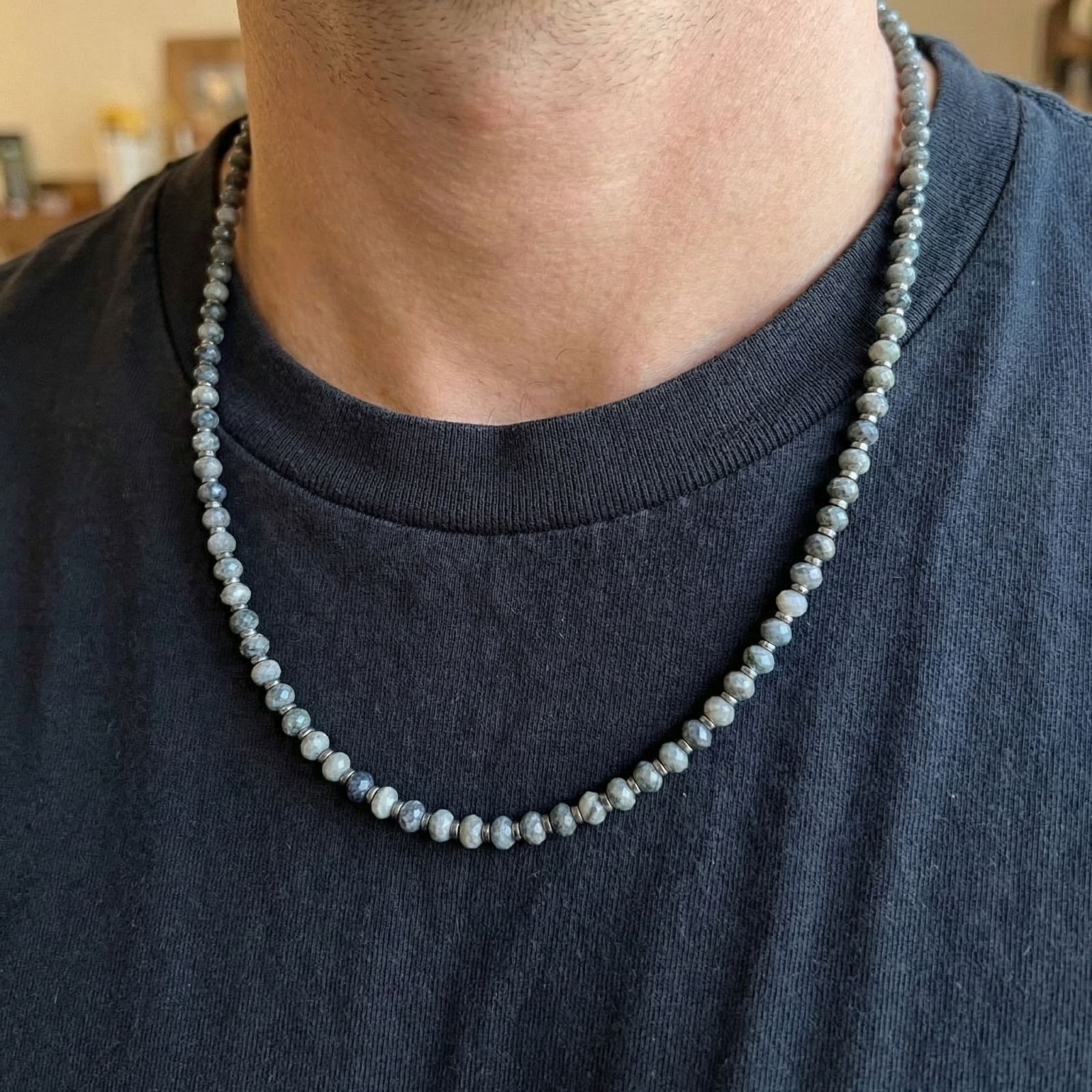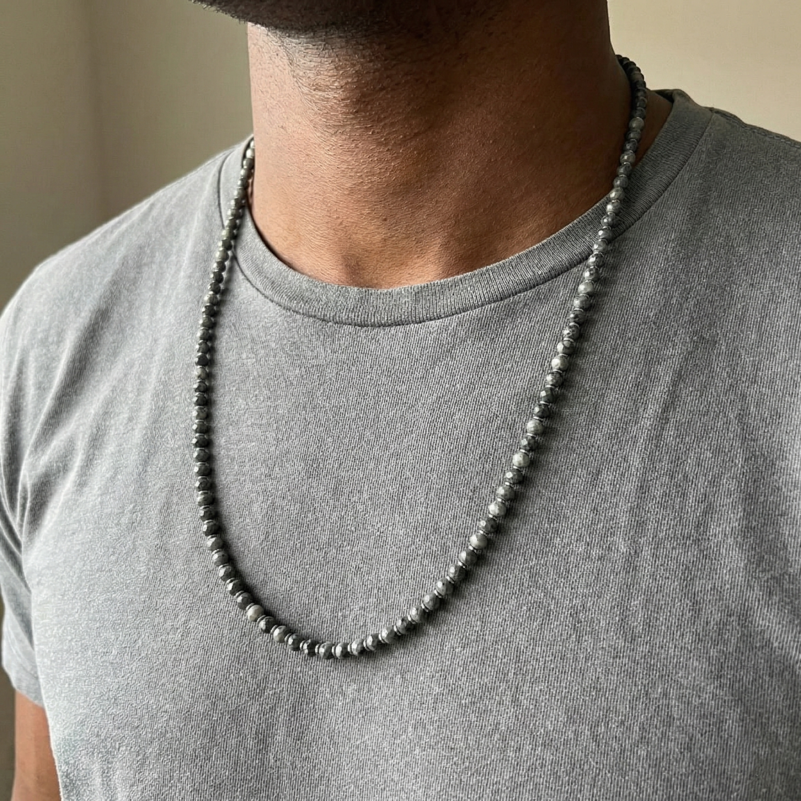 שרשרת לגבר בעבודת יד שזורה מאבני ג’ספר בגווני אפור-שמנת עם דוגמה טבעית ייחודית.