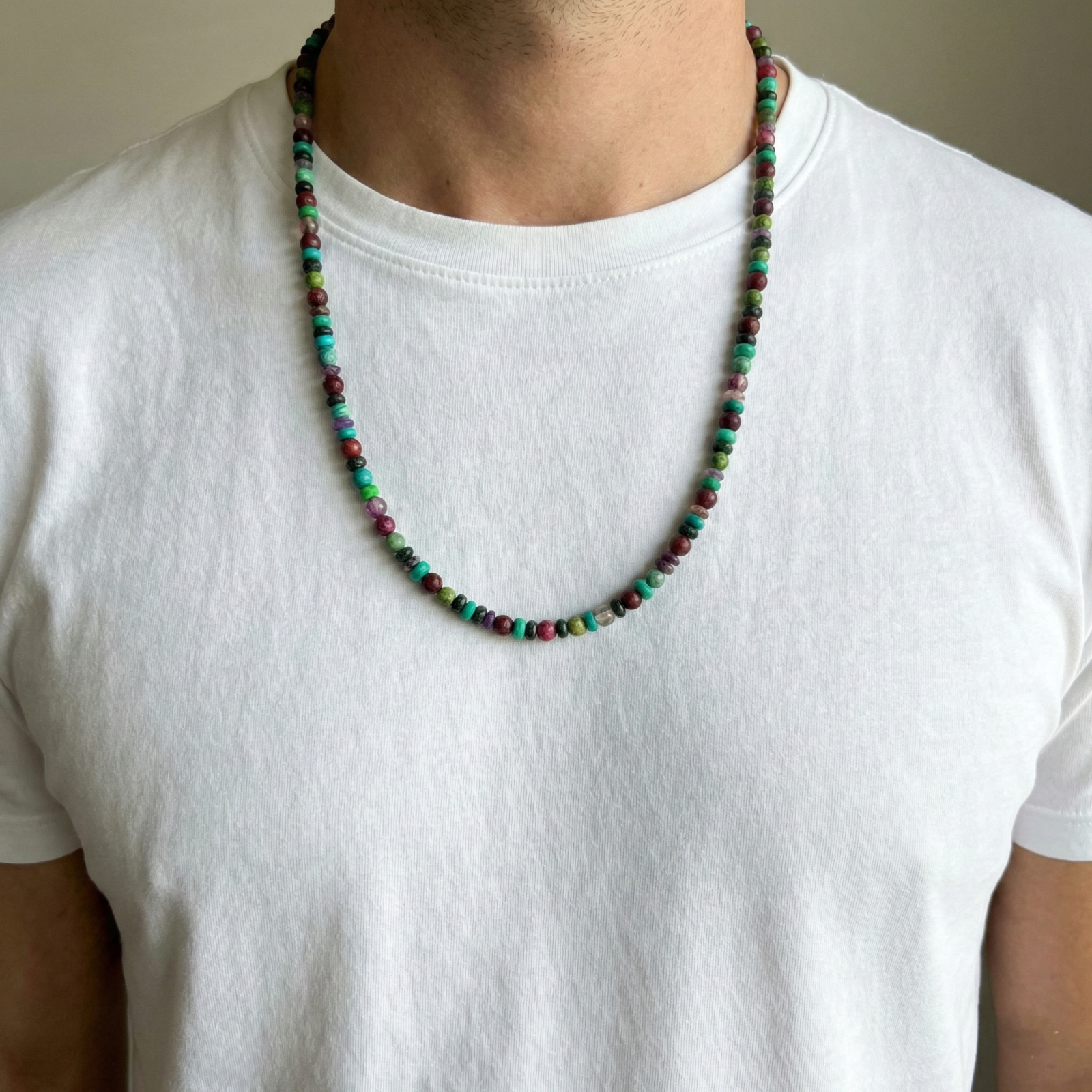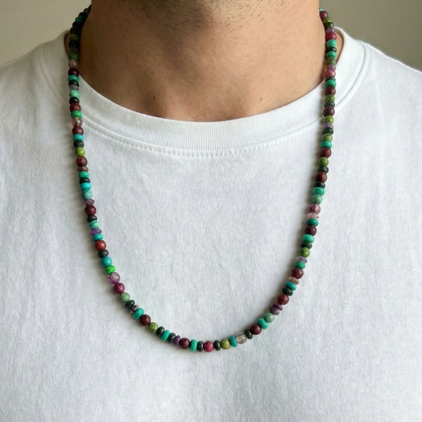 שרשרת עבודת יד לגבר שזוורה משילוב מלא חיים של אבני טורקיז, אבני אגת (Pink Agate) בגווני בורדו עז, אבני ג'ייד ירוקות ואבני אמטיסט סגולות.