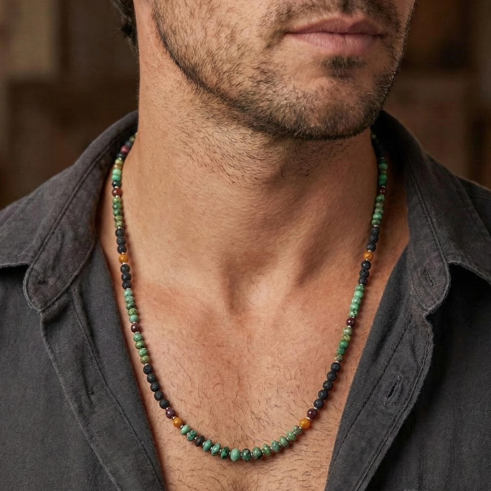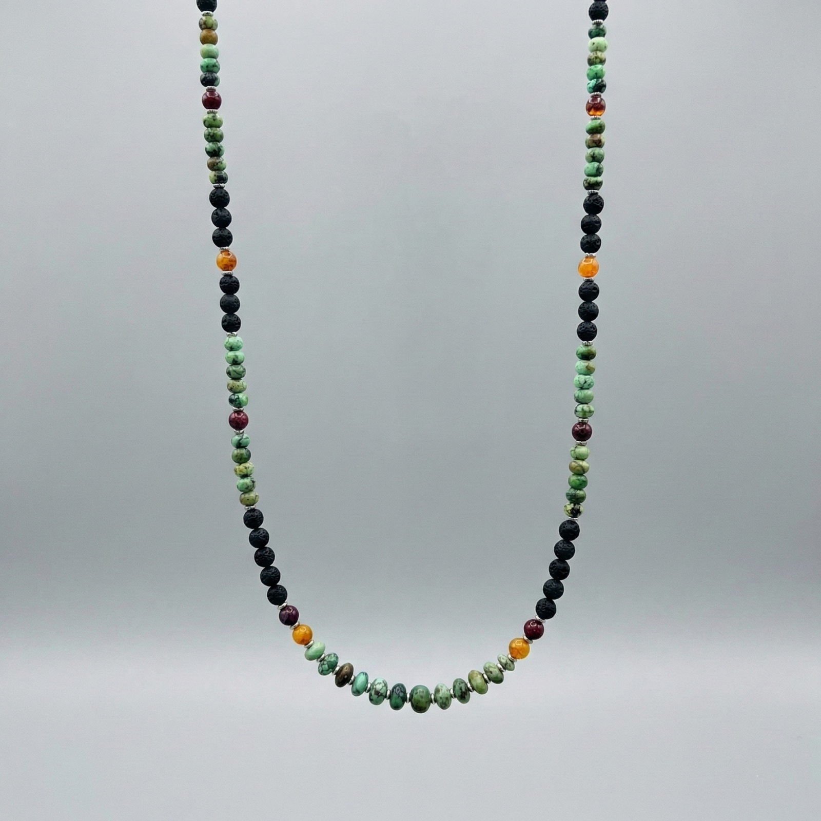 שרשרת מאלה לגבר שזורה בעבודת יד מאבני טורקיז אפריקאי, לבה שחורה ואבני מוקייט בורדו וחרדל.