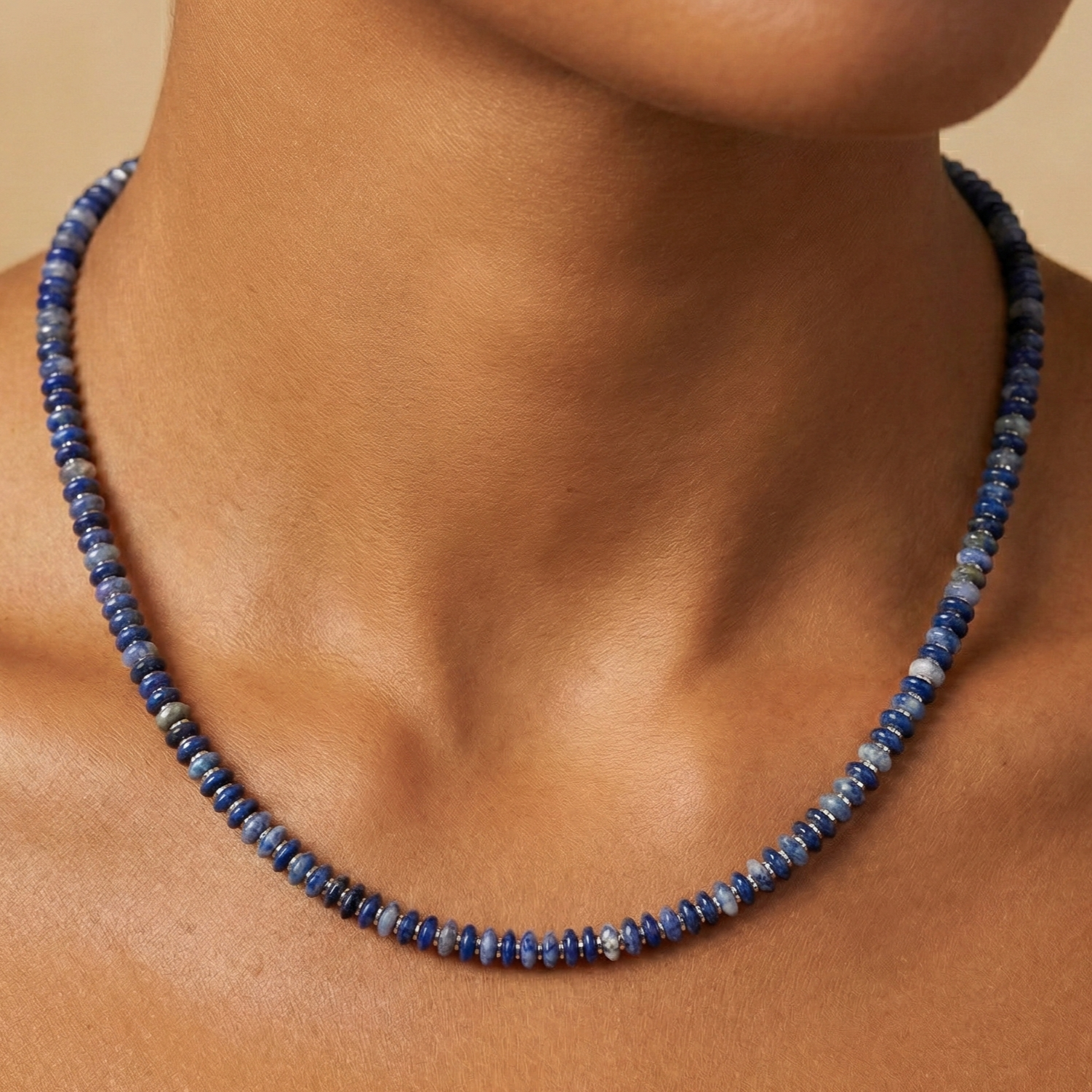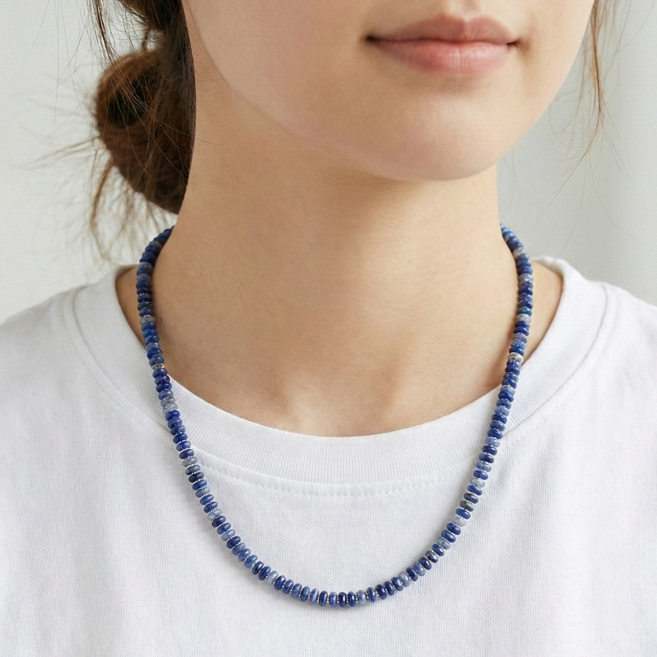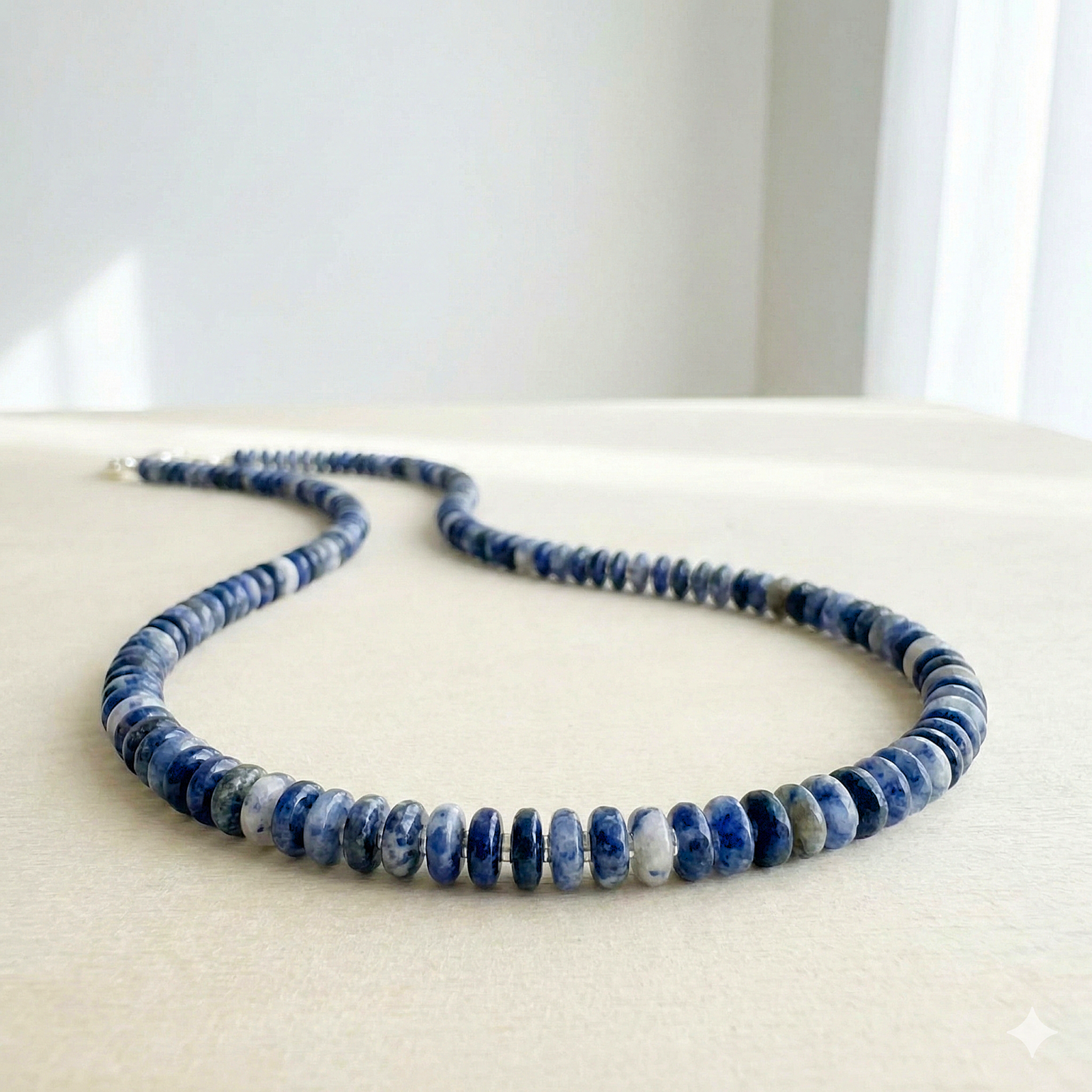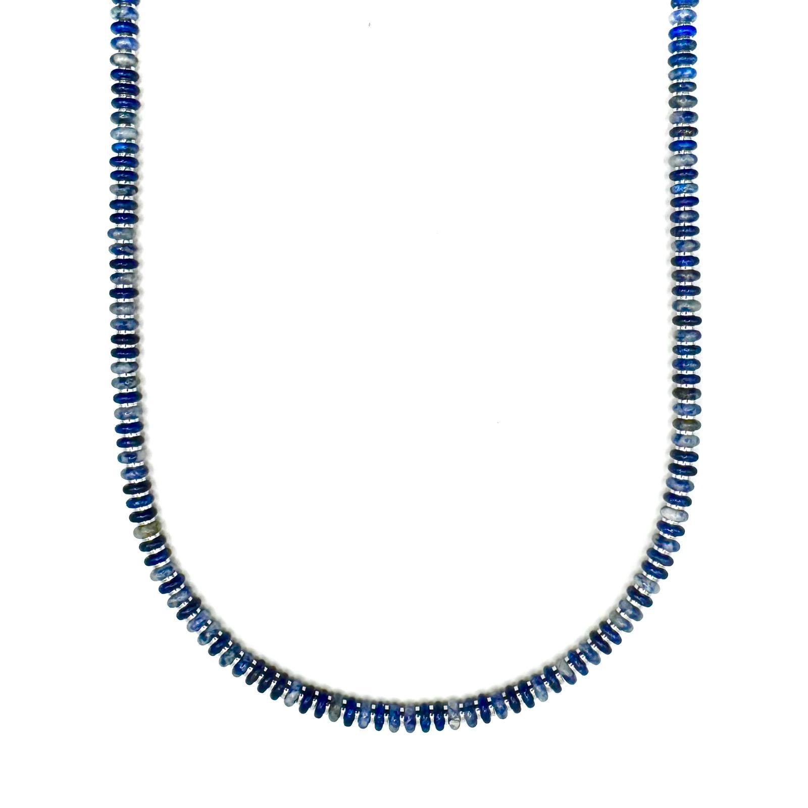 שרשרת לנשים בעבודת יד שזורה מאבני סודלייט בגווני כחול ושמנת וביניהן אבני המטייט כסופות מבריקות.