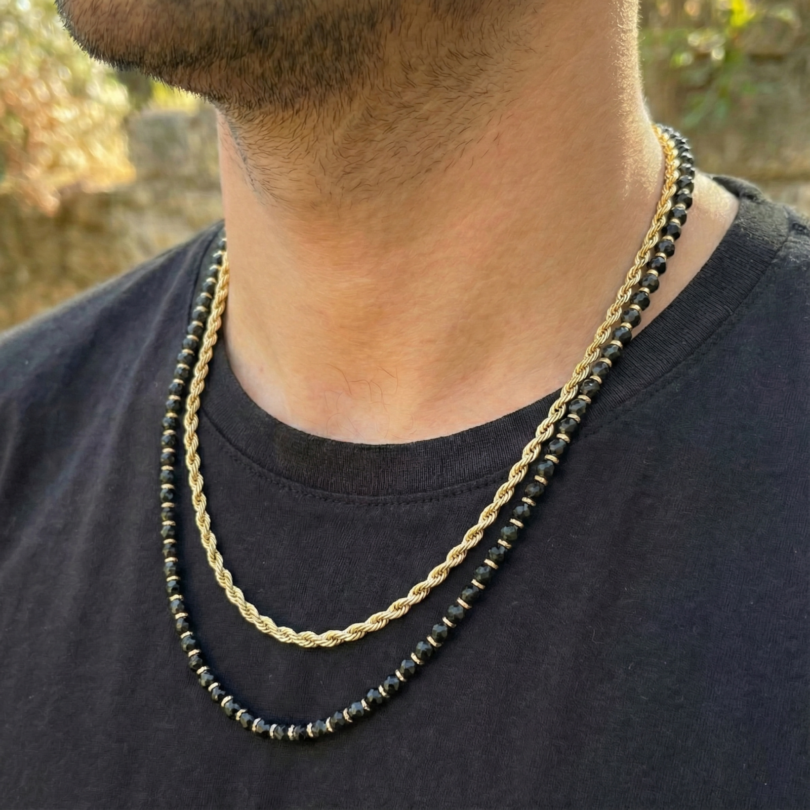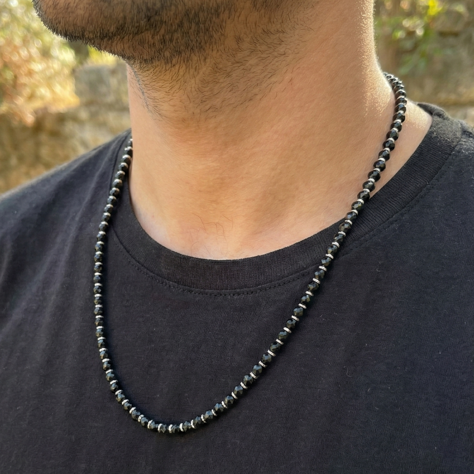 שרשרת לגבר אלגנטית שזורה בעבודת יד מאבני אוניקס שחורות מבריקות ומסותתות עם הפרדות של חרוזי אבן המטייט מוזהבים או כסופים.