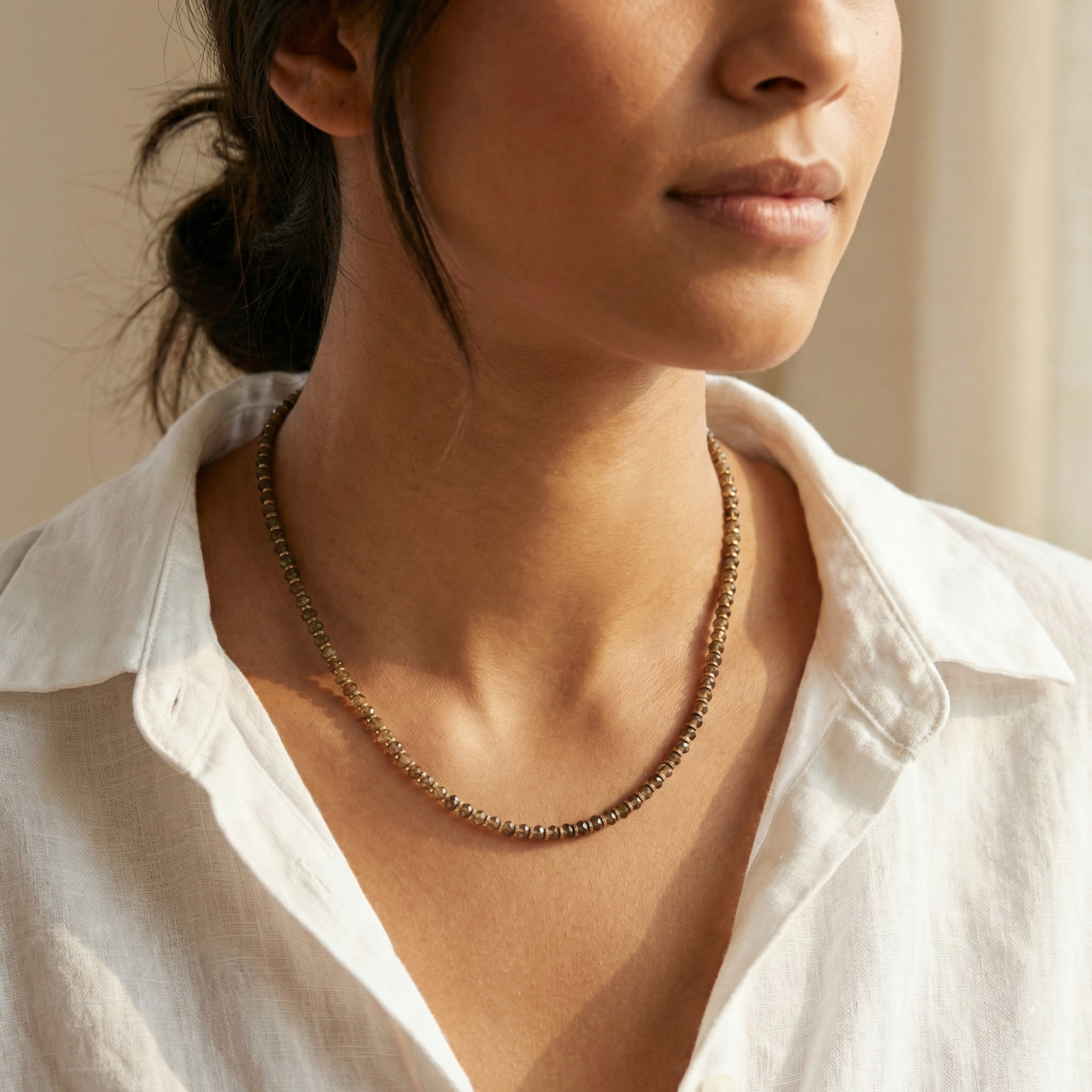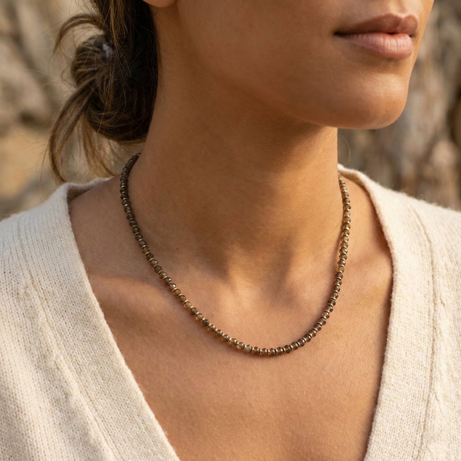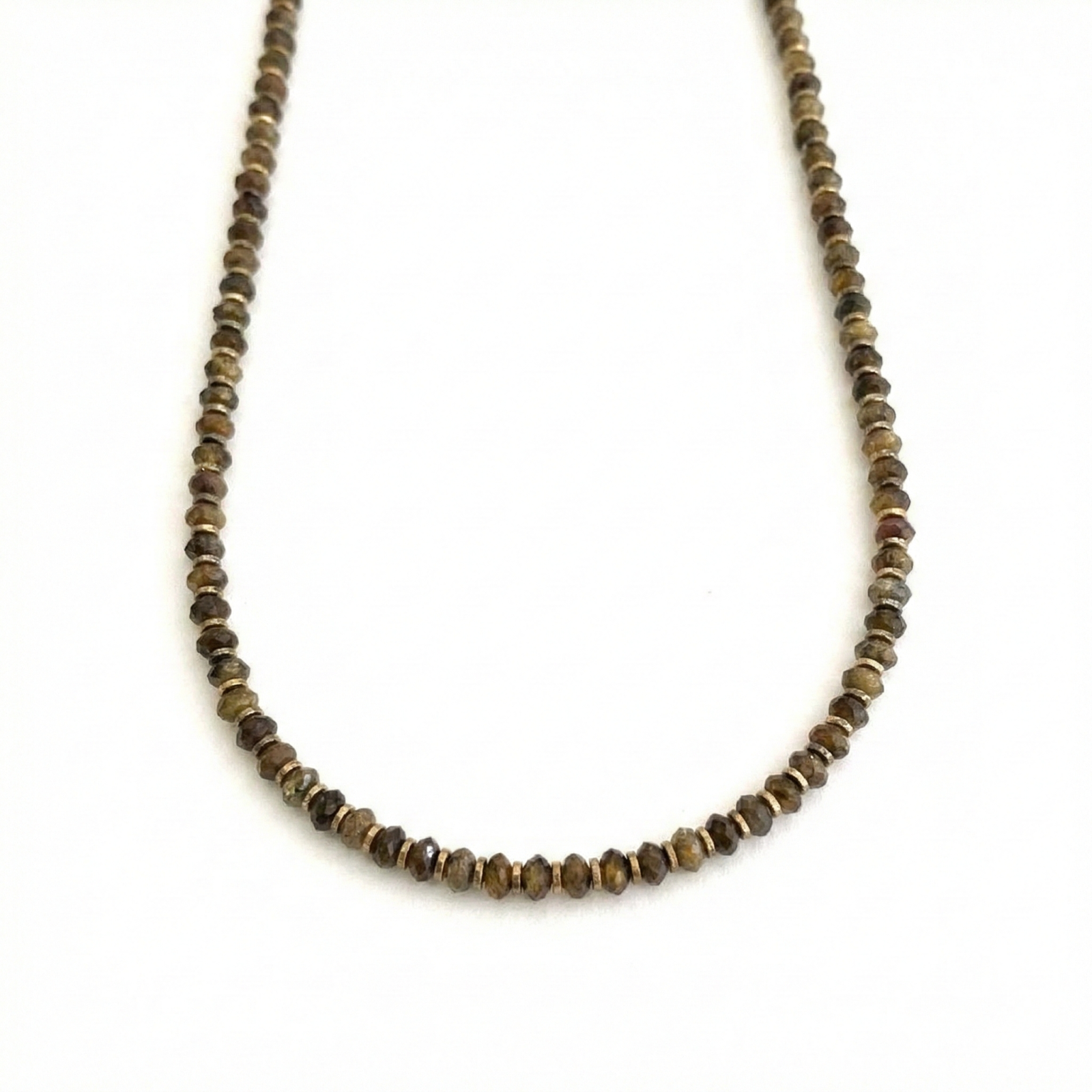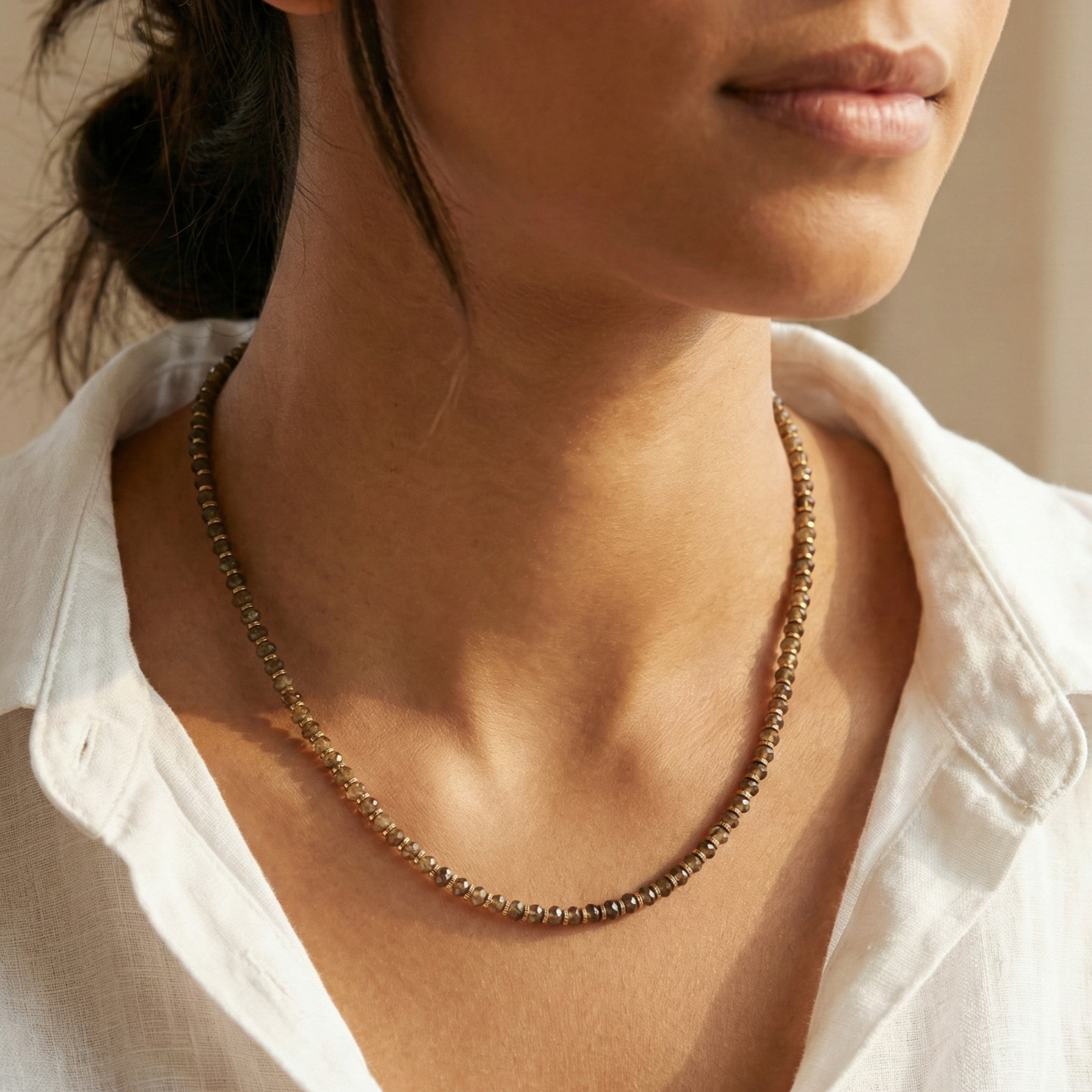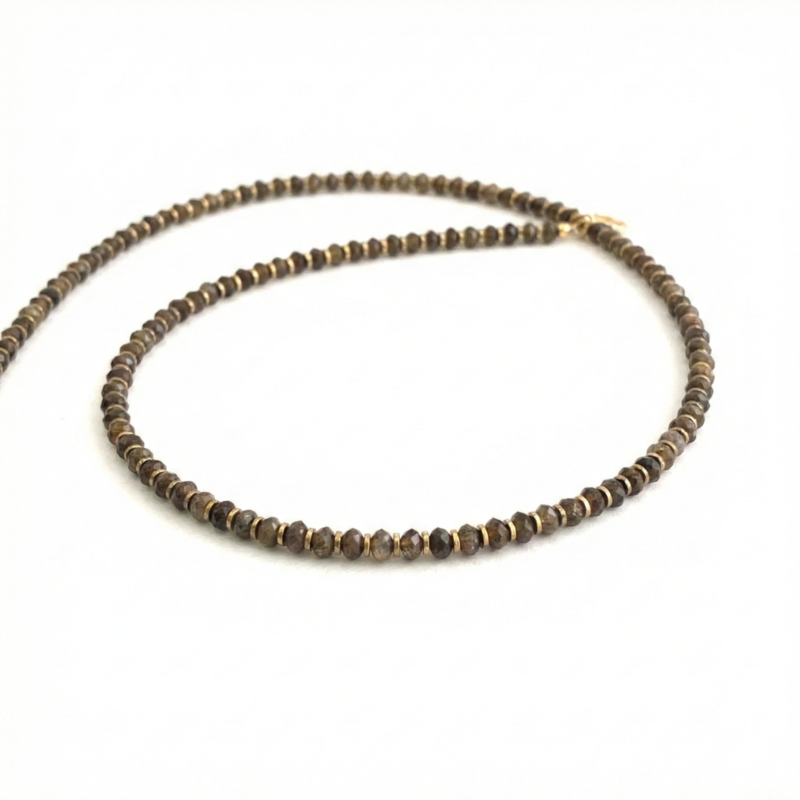 שרשרת לנשים בעבודת יד שזורה מאבני לברדורייט חומות מסותתות עם הפרדות חרוזי המטייט מוזהבים.