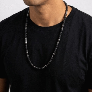 שרשרת מאלה במראה אקזוטי וקסום, מורכבת מאבני לבה שחורות, אבני ג'ספר בהירות ואבני טורקיז בהירות.