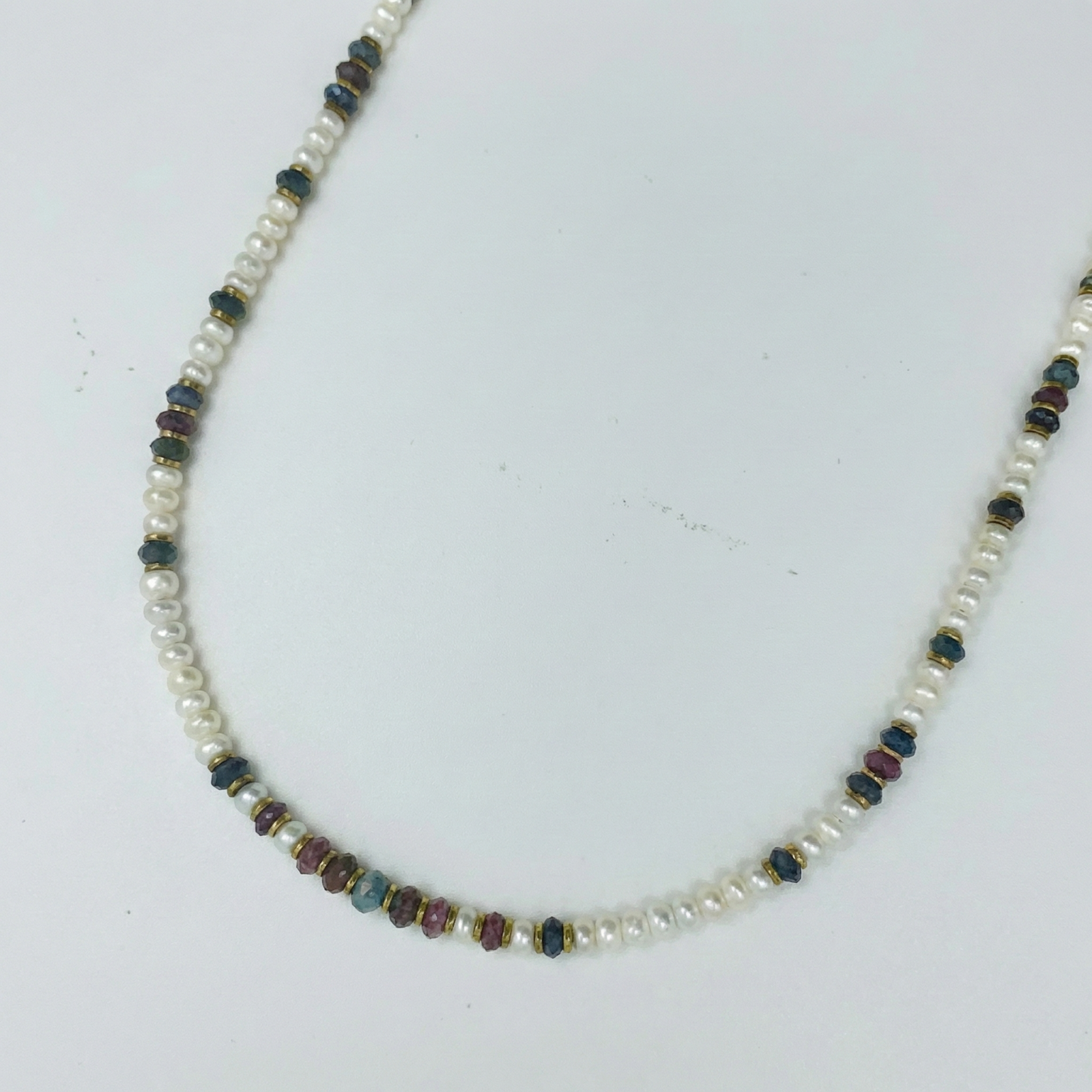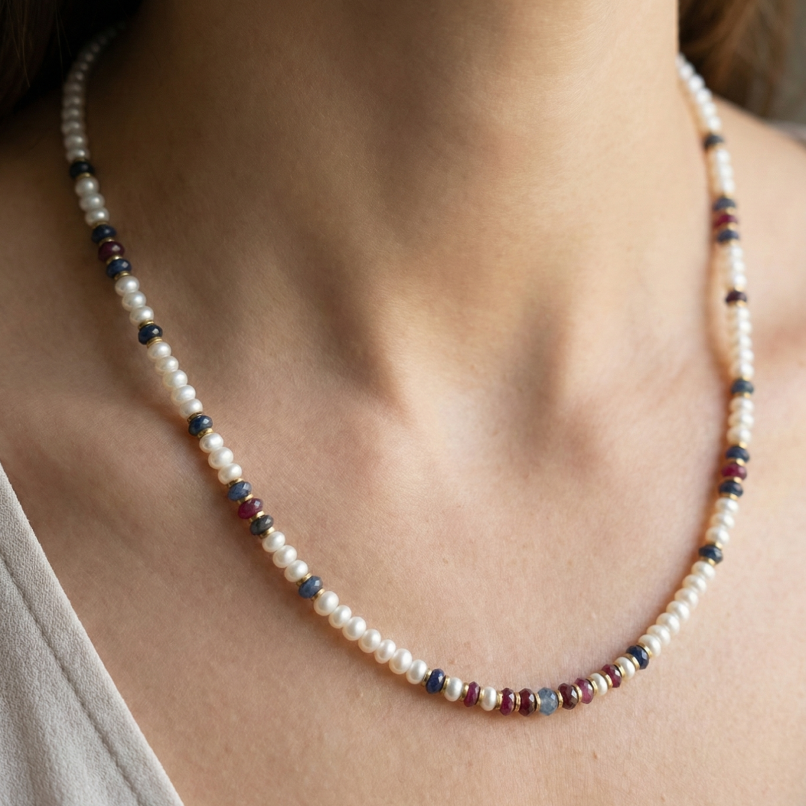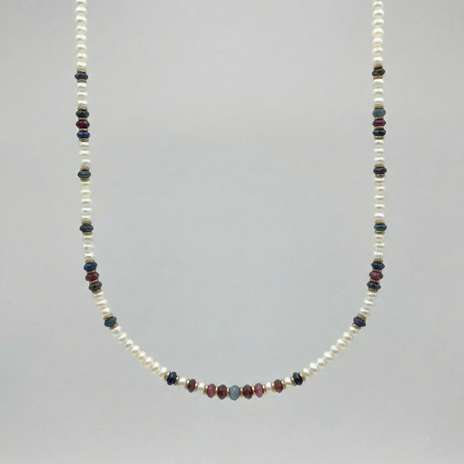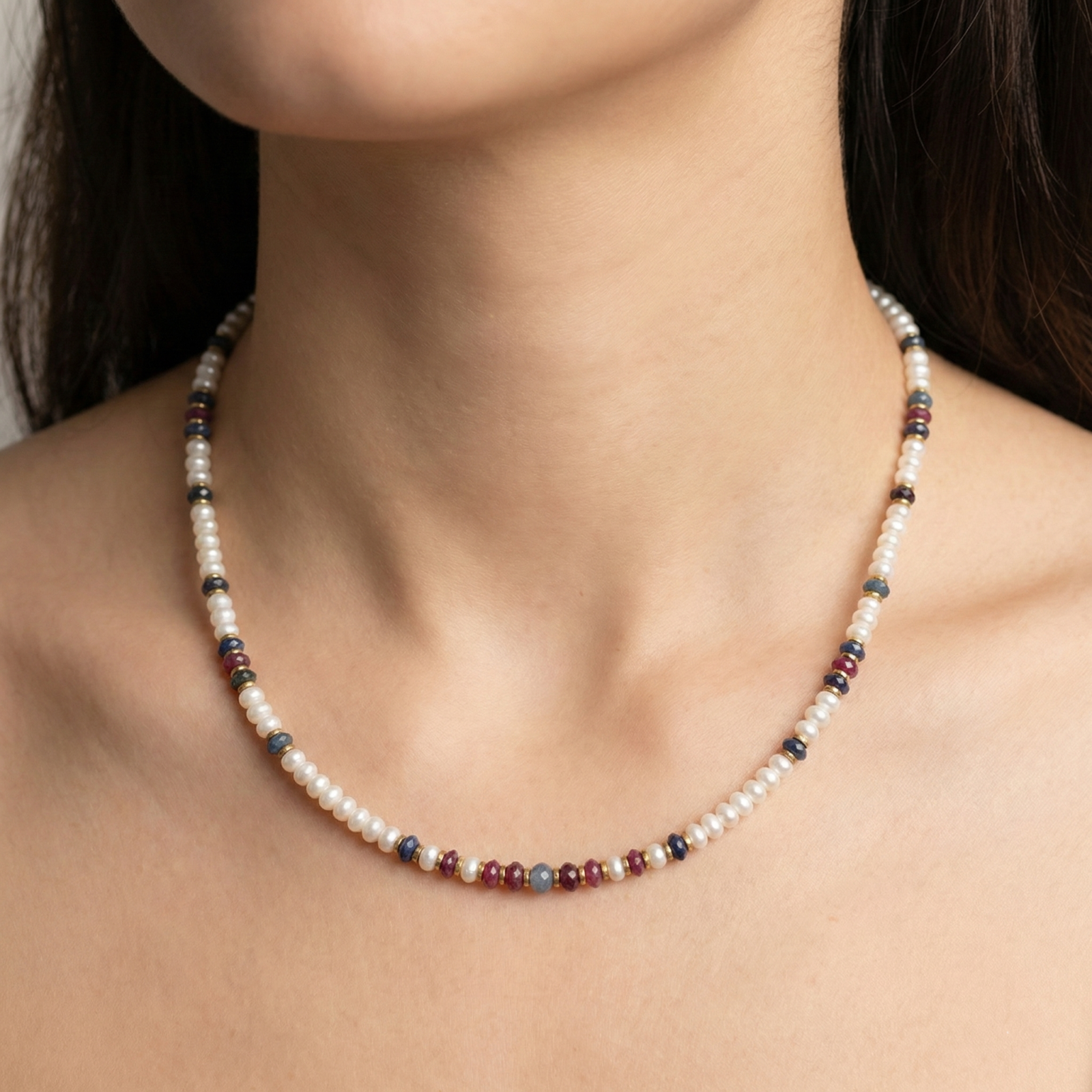 שרשרת מפנינים אמיתיות בשילוב אבני רובי וספיר היוקרתיות בגוונים עשירים של בורדו, כחול עמוק ואפור-כסוף. שילוב קלאסי ונועז שמשדר יוקרה טבעית.