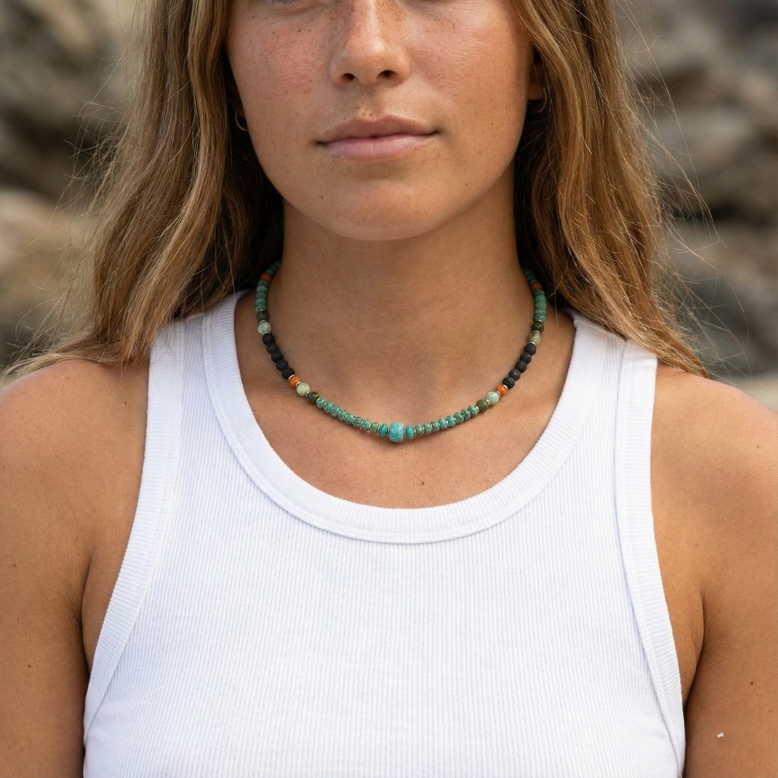 השרשרת משלבת אבני טורקיז, לבה , ג'ספר ירוק ואבני קורל כתומות.