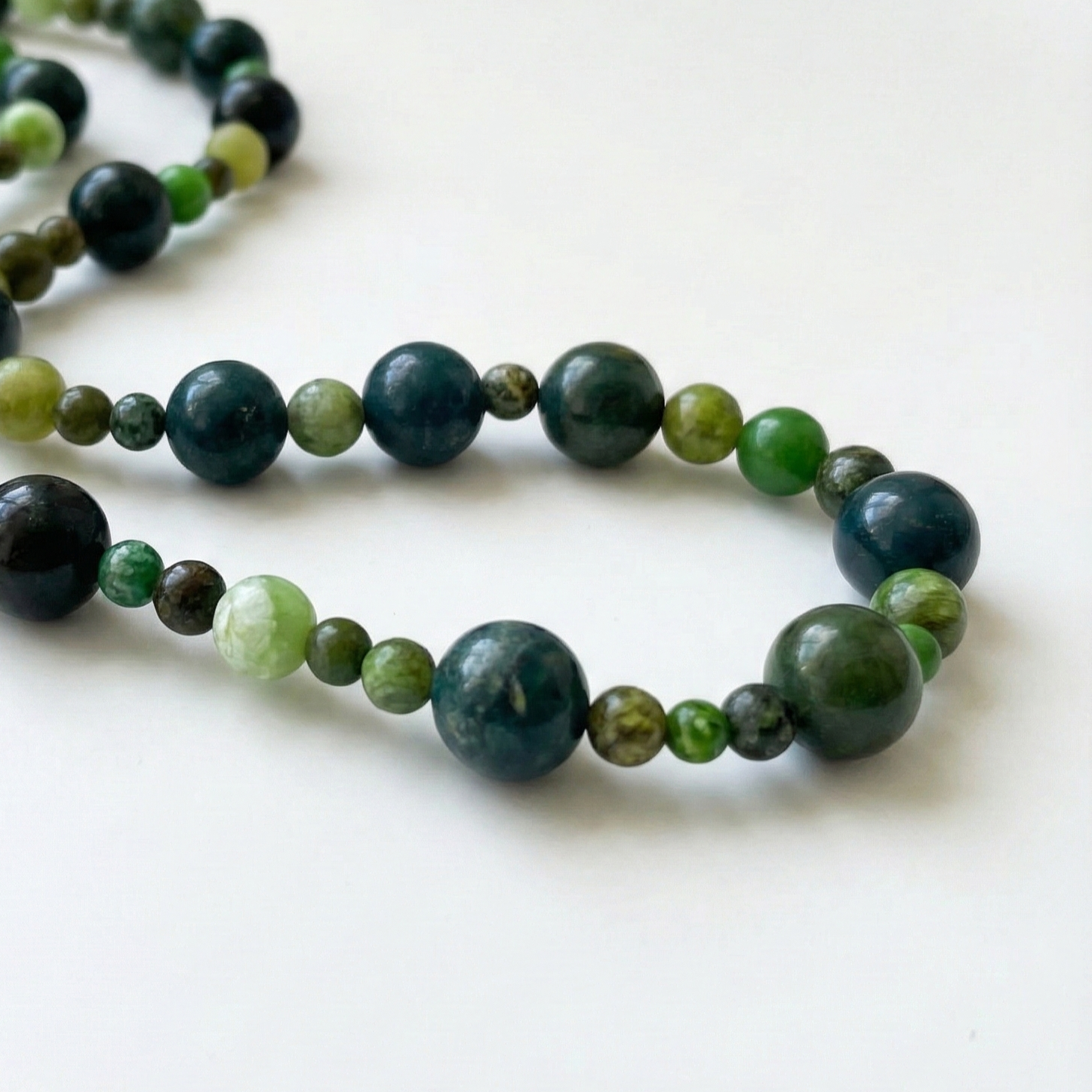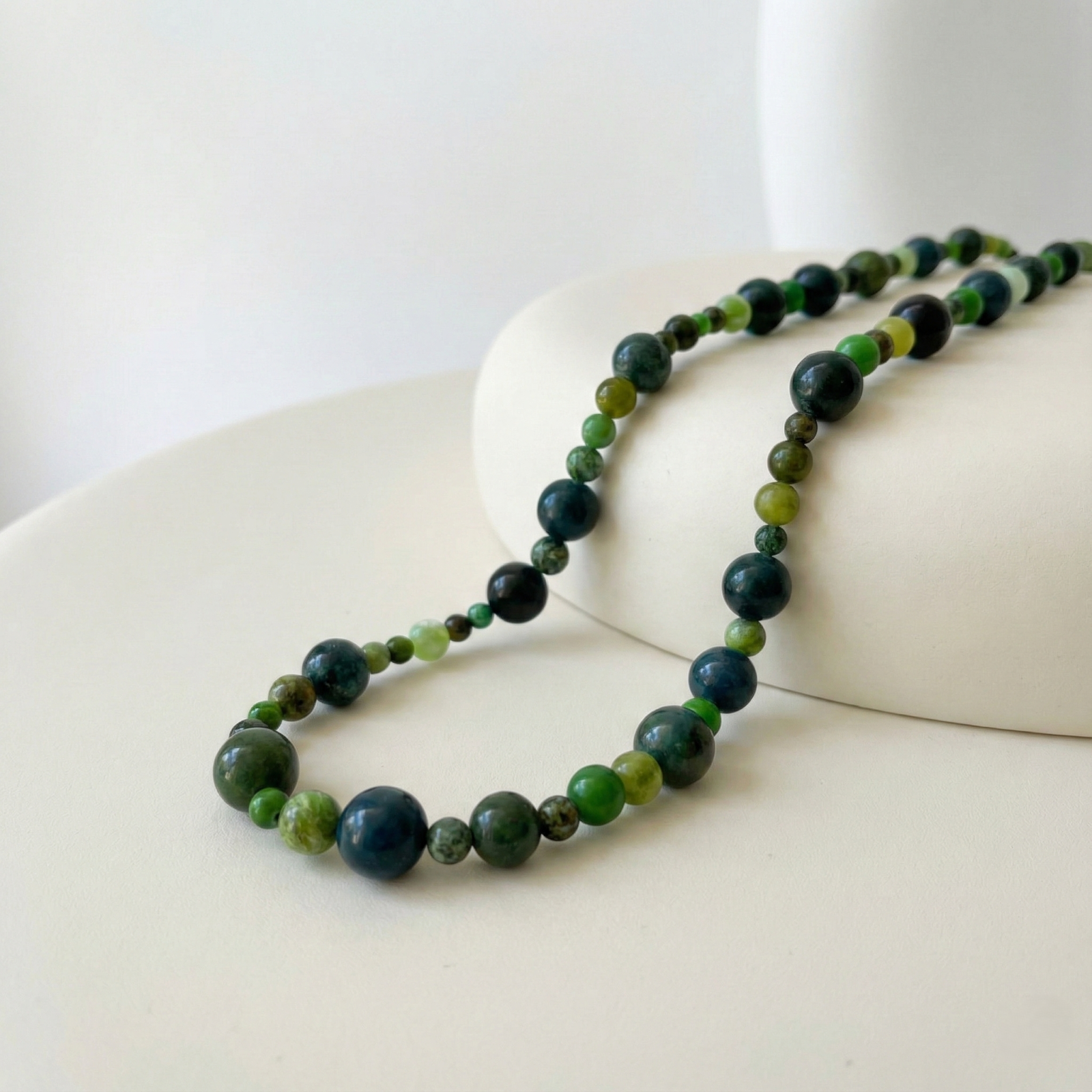 שרשרת לנשים בעבודת יד שזורה מאבני ג'ספר ואגת בגוונים מהפנטים של ירוק עמוק.